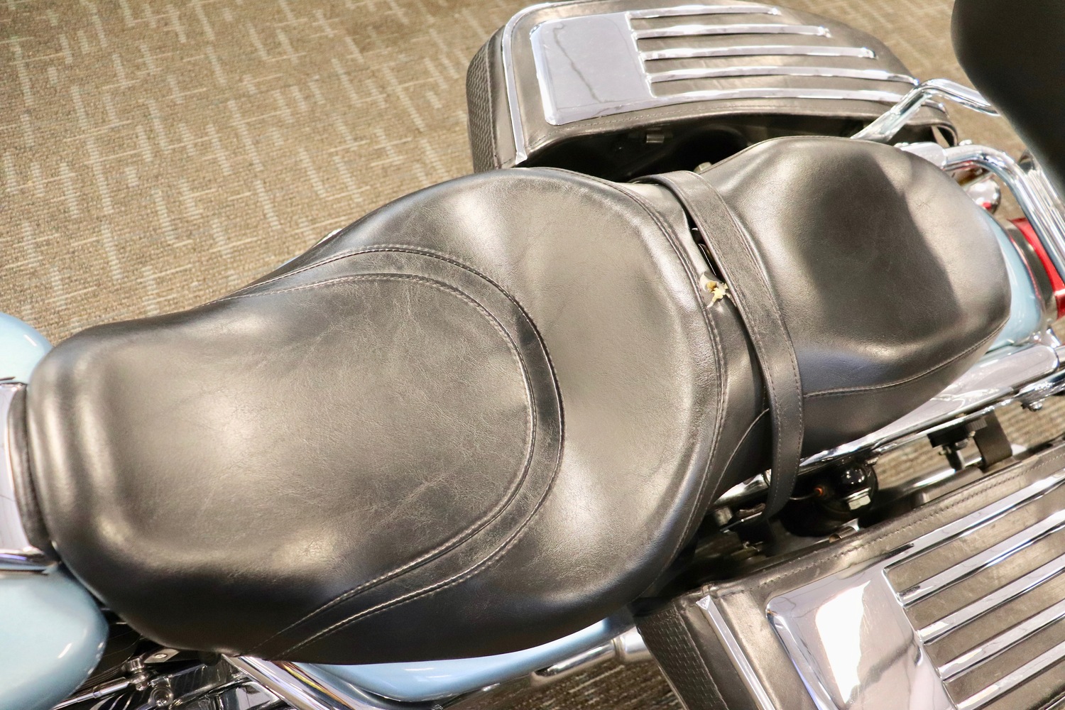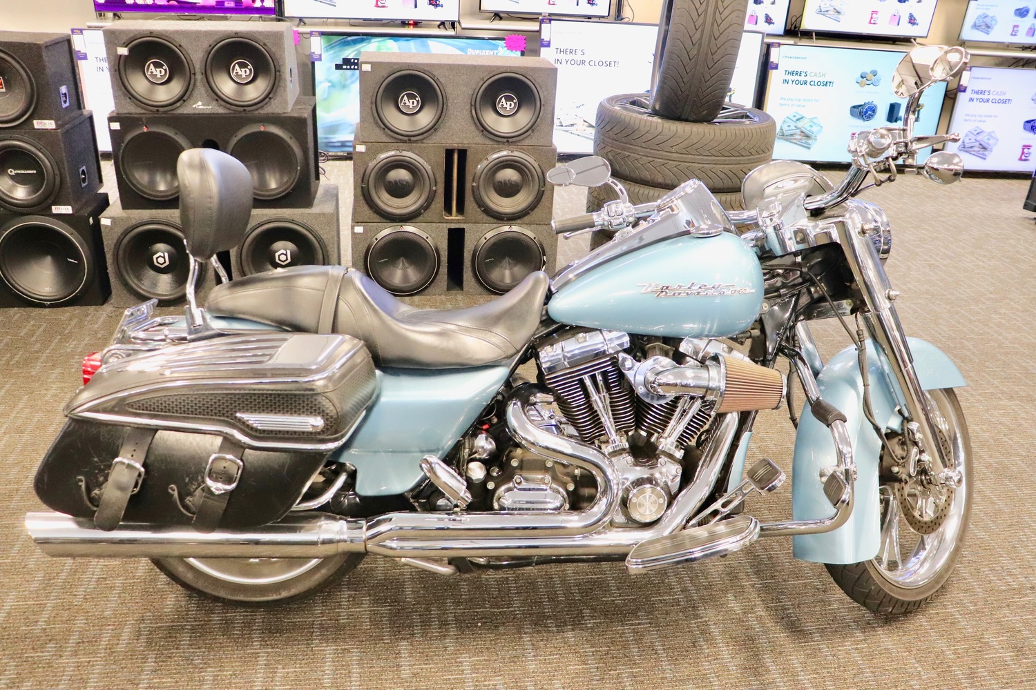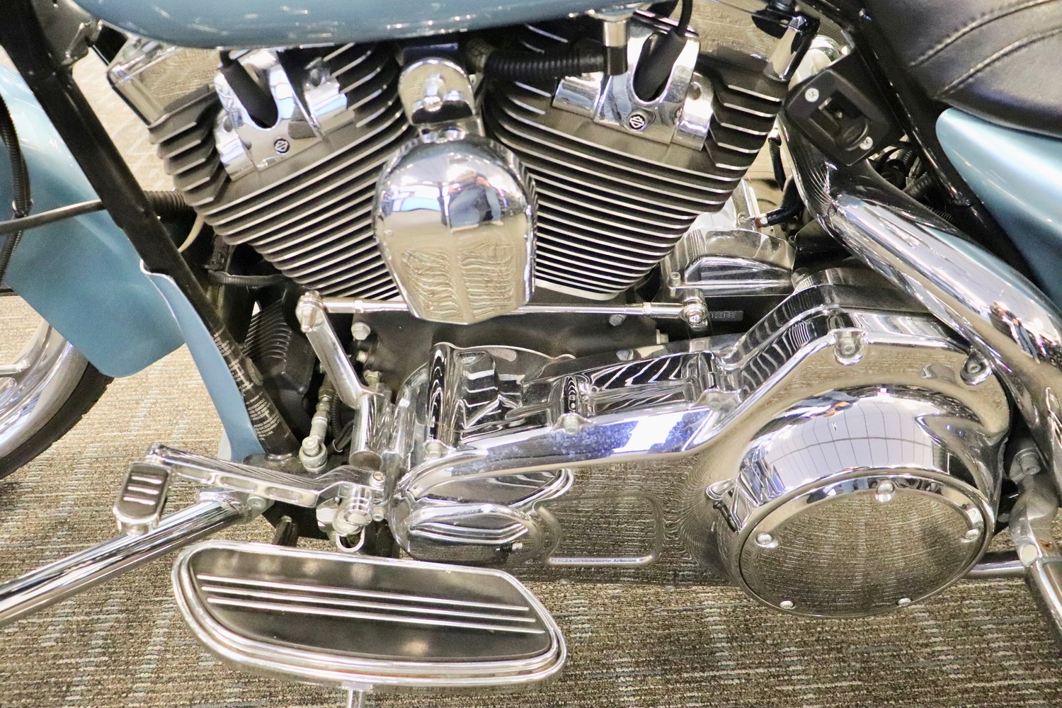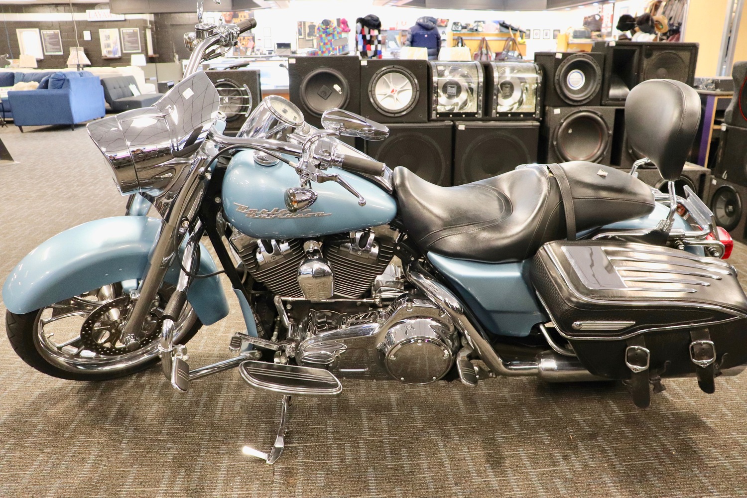 This is a 2007 Harley-Davidson FLHRS Road King Custom, finished in a gorgeous light blue with blacked-out and chrome accents. A classic touring bike with unmistakable Road King presence, showing 43,398 miles and clearly cared for. Stored indoors and presented in very nice overall condition- this one turns heads even while parked.