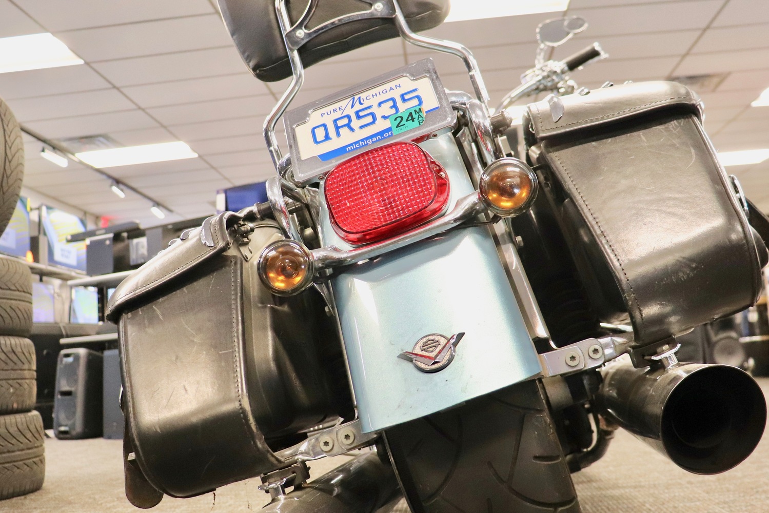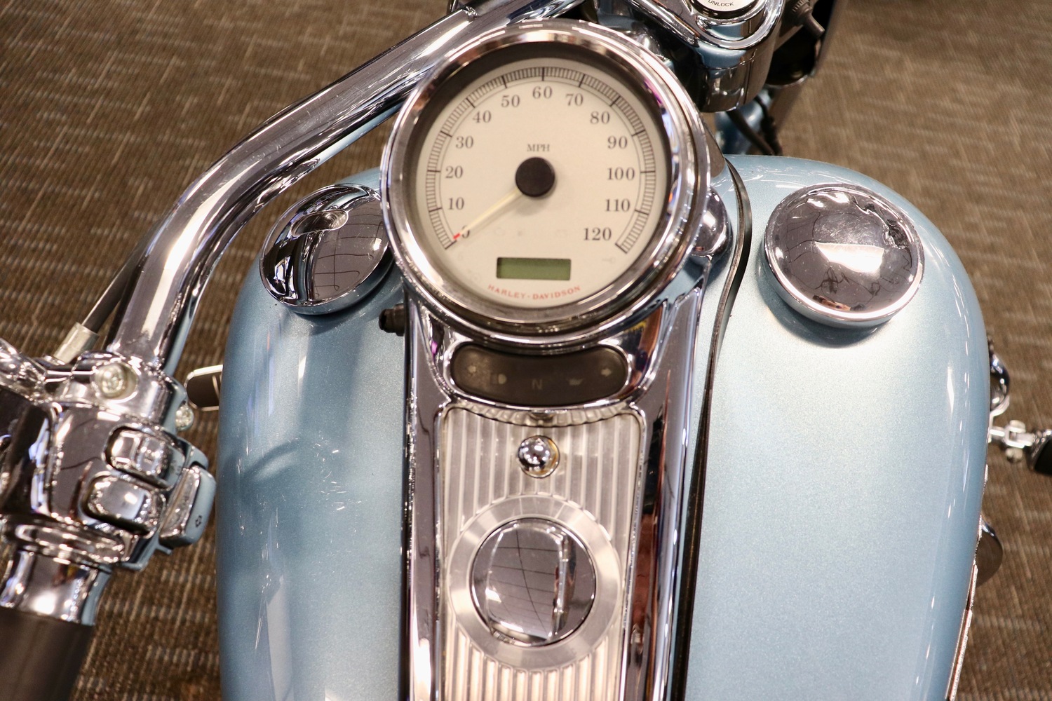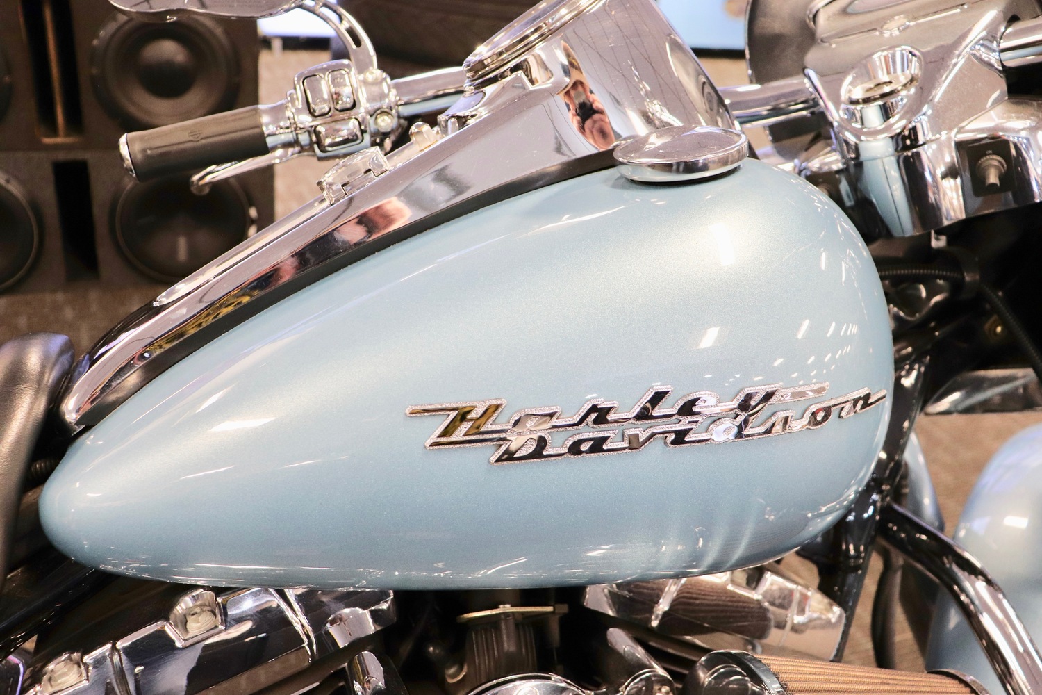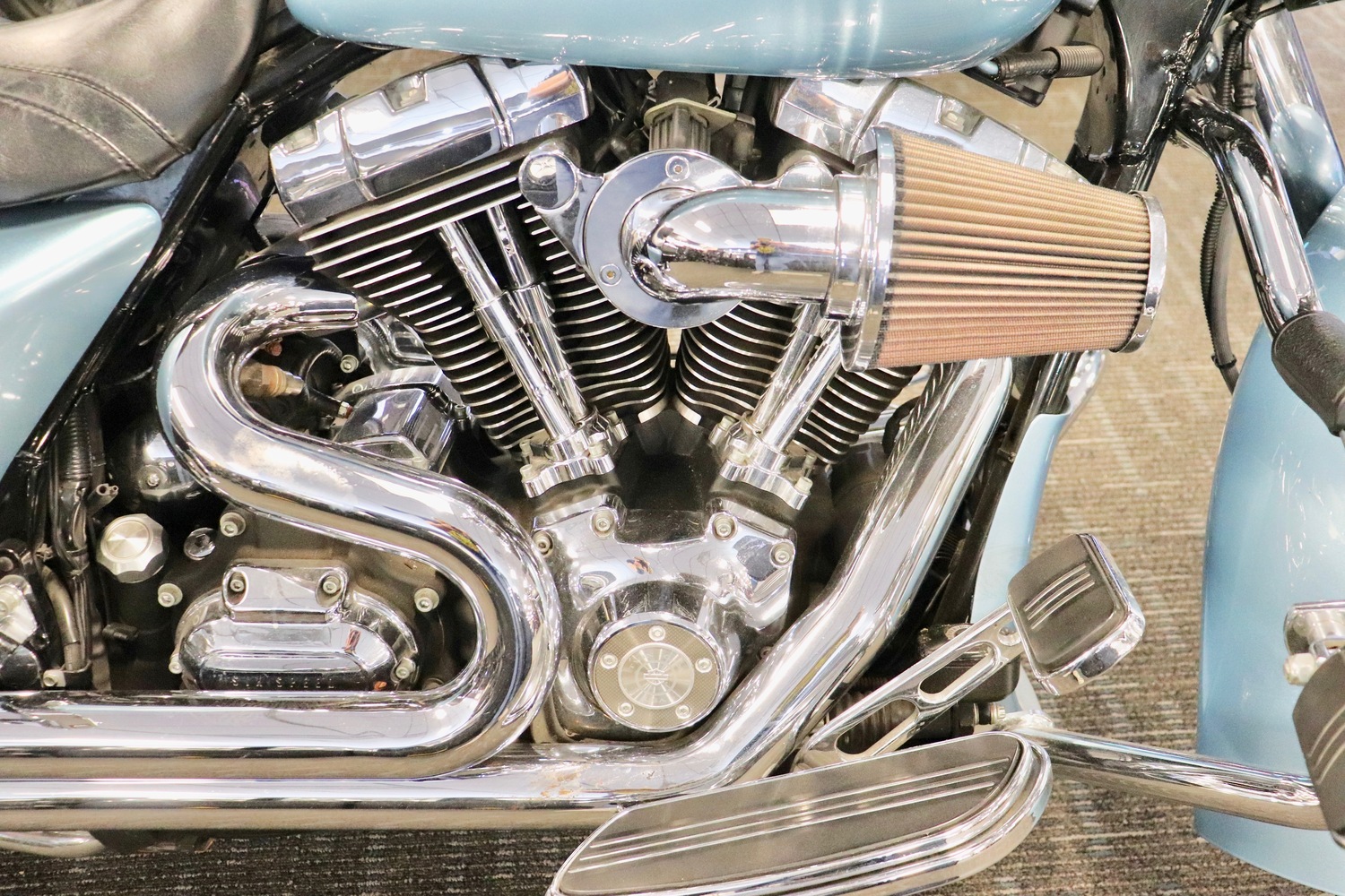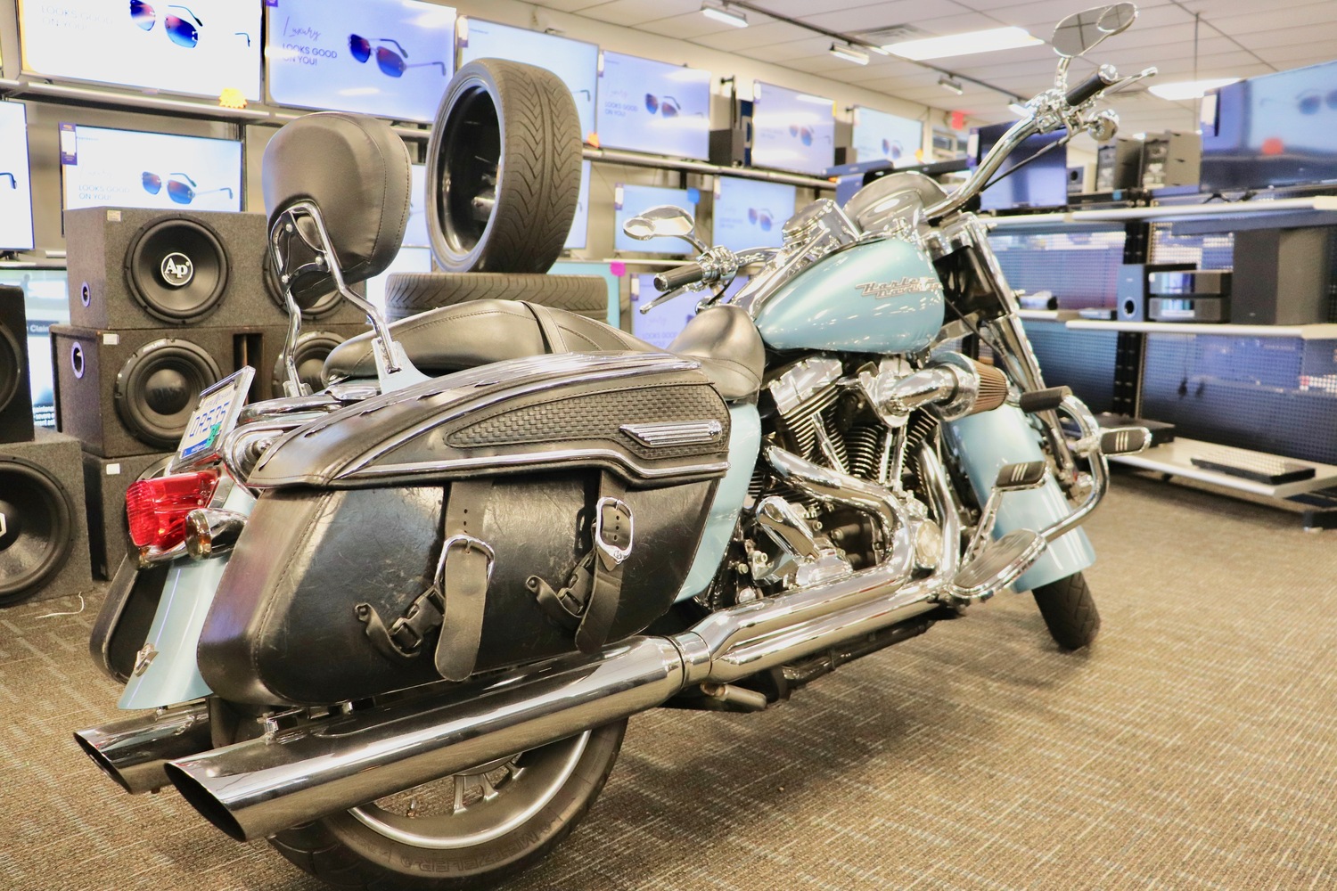 This is a 2007 Harley-Davidson FLHRS Road King Custom, finished in a gorgeous light blue with blacked-out and chrome accents. A classic touring bike with unmistakable Road King presence, showing 43,398 miles and clearly cared for. Stored indoors and presented in very nice overall condition- this one turns heads even while parked.