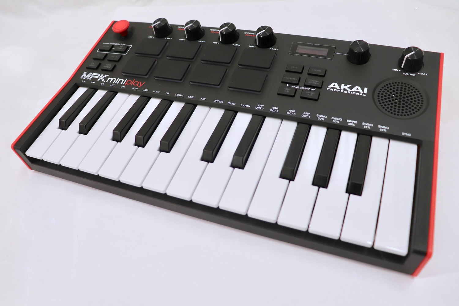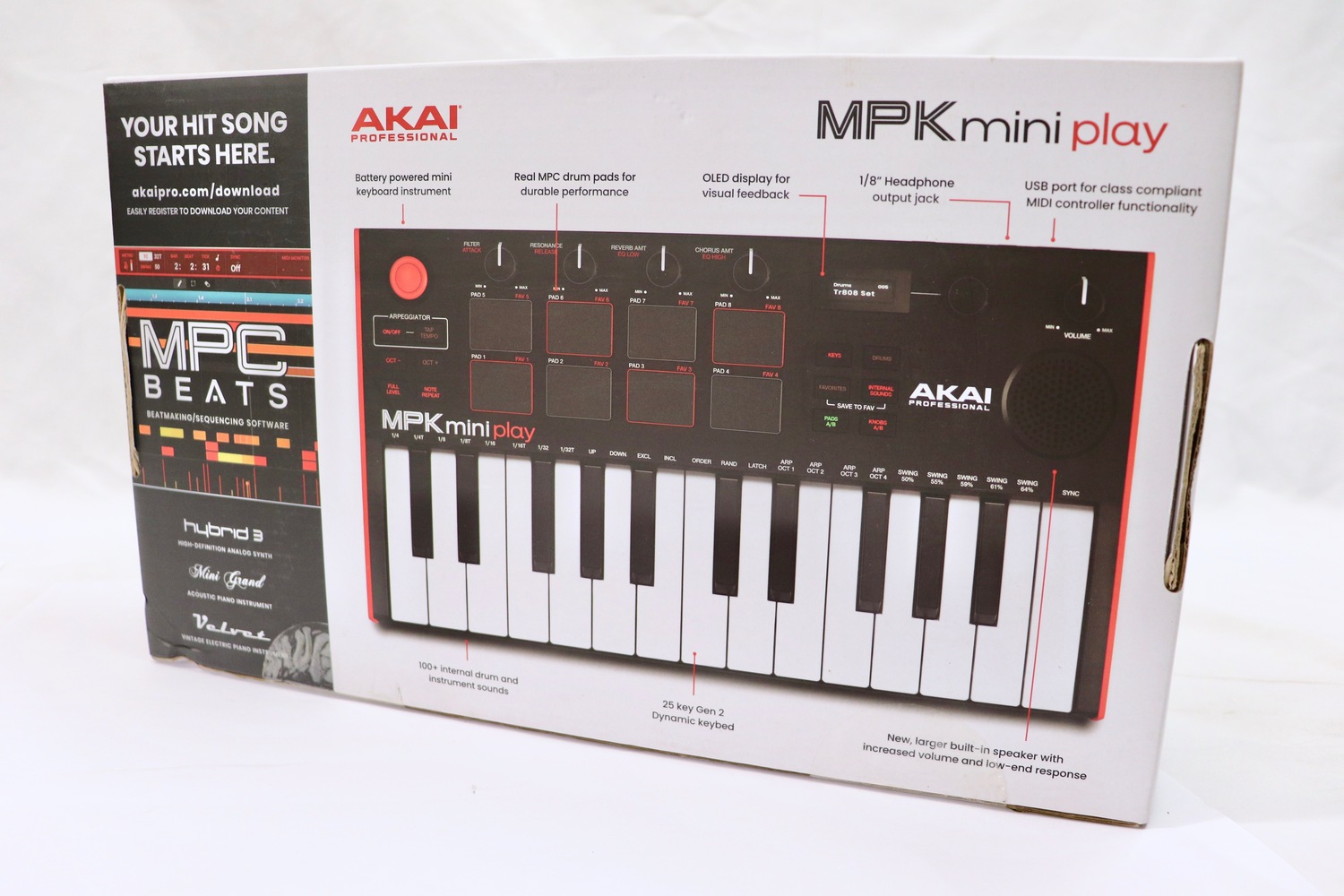 The MPK Mini Play functions as both a standalone keyboard with internal sounds and speaker, and as a USB MIDI controller for use with DAWs and music software.