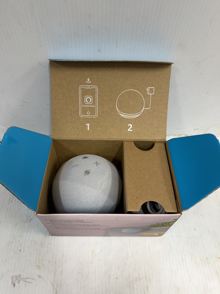 Amazon Echo Dot (5th Gen) smart speaker in Glacier White. Device is in excellent working and cosmetic condition and includes the original box and power adapter. Perfect for smart home control, music streaming, alarms, and everyday Alexa use. Ready to set up and use.
