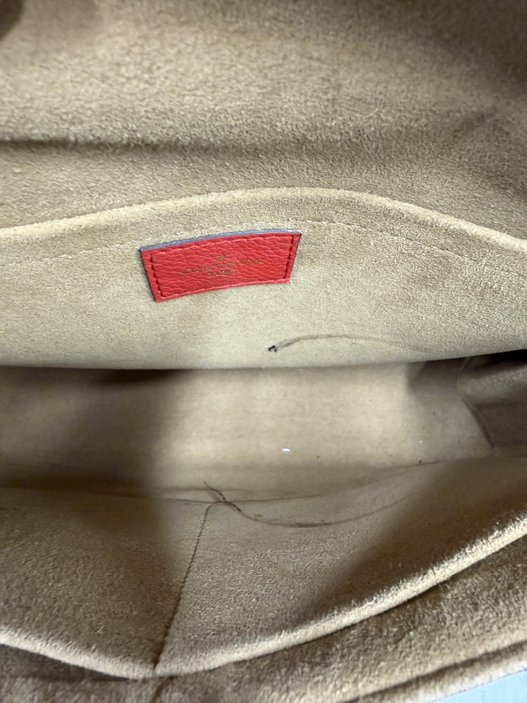 Authentic Louis Vuitton shoulder bag crafted in classic Monogram coated canvas with a striking red leather accent pocket. Features gold-tone hardware with a secure push-lock closure and a detachable adjustable shoulder strap for versatile wear. This bag comes with an Entrupy Certificate of Authenticity, ensuring authenticity and peace of mind for the buyer. A stylish and functional luxury piece perfect for everyday use or collection.