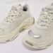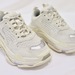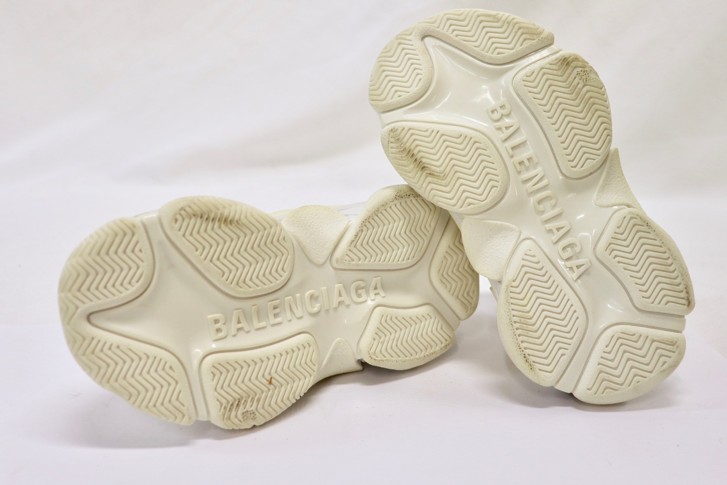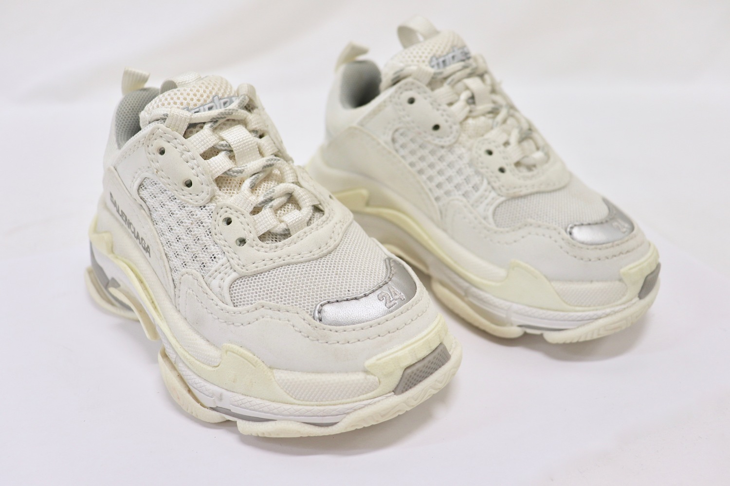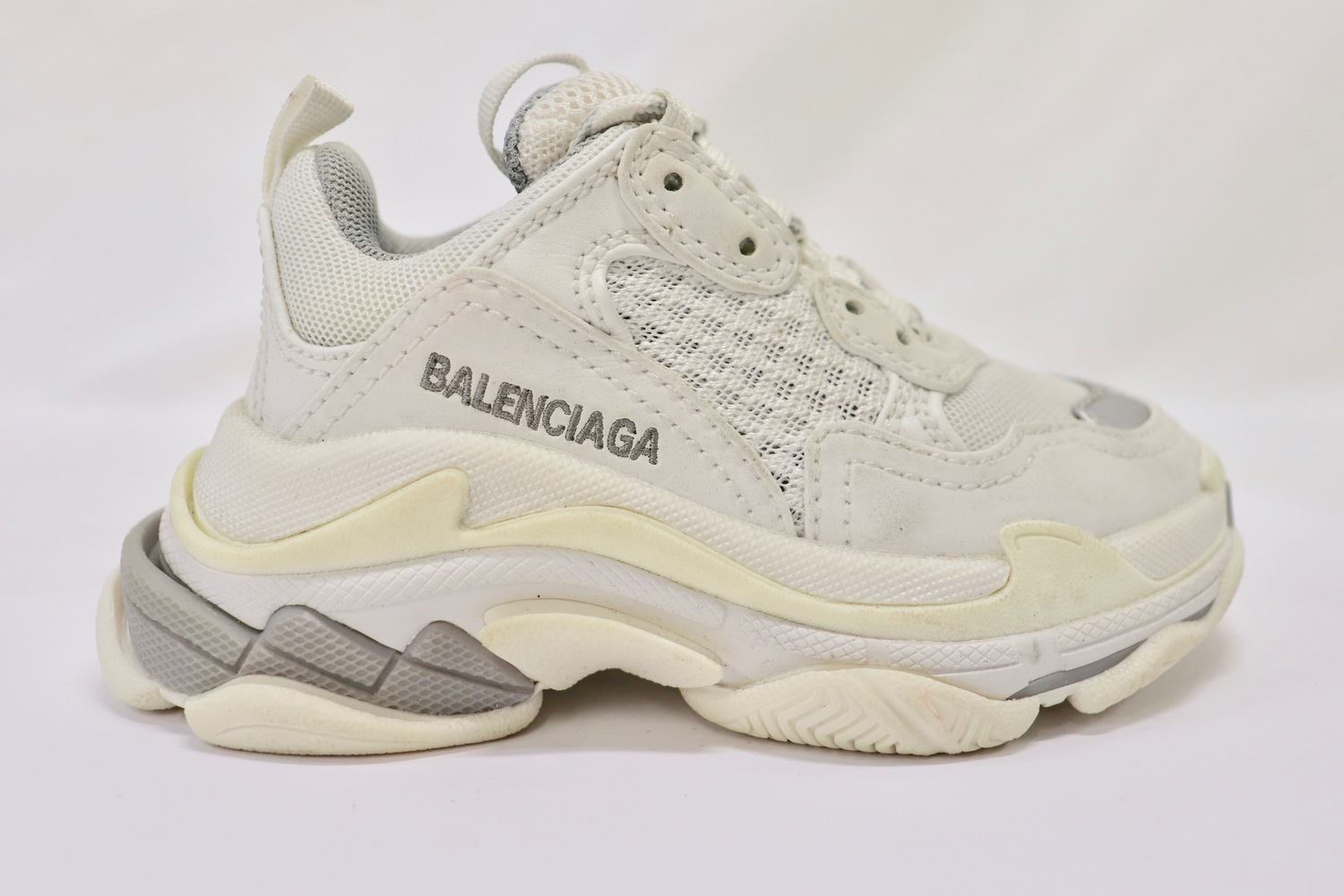 Authentic Balenciaga Triple S sneakers for kids in White / Metallic Grey. These feature the signature oversized Triple S sole with layered mesh and synthetic uppers. Pre-owned with visible signs of wear consistent with use, but remain fully wearable and structurally sound. A standout luxury sneaker in a hard-to-find kids size.