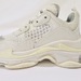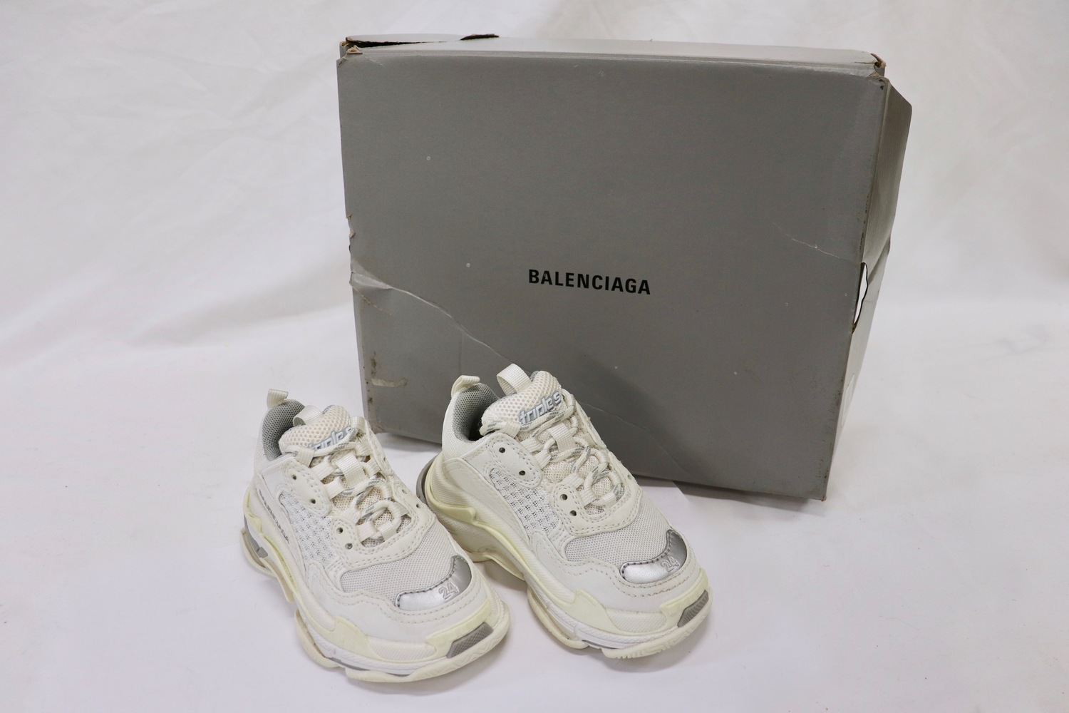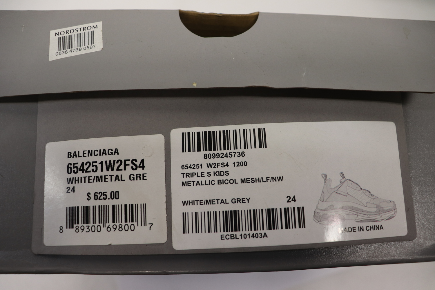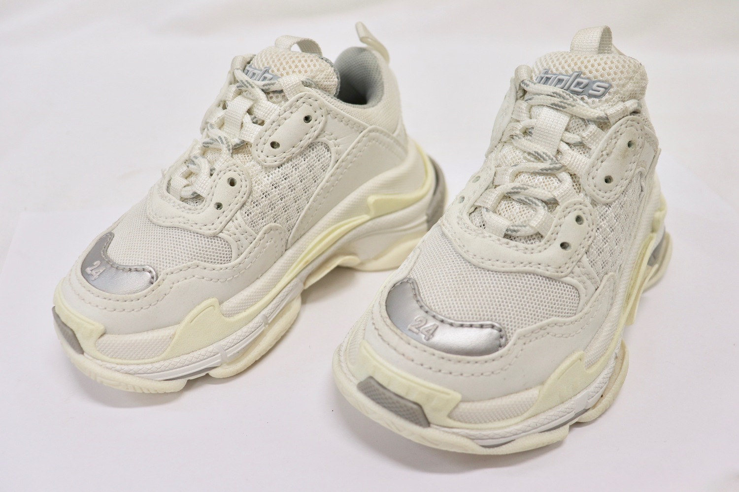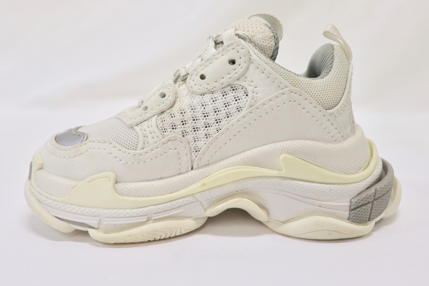 Authentic Balenciaga Triple S sneakers for kids in White / Metallic Grey. These feature the signature oversized Triple S sole with layered mesh and synthetic uppers. Pre-owned with visible signs of wear consistent with use, but remain fully wearable and structurally sound. A standout luxury sneaker in a hard-to-find kids size.