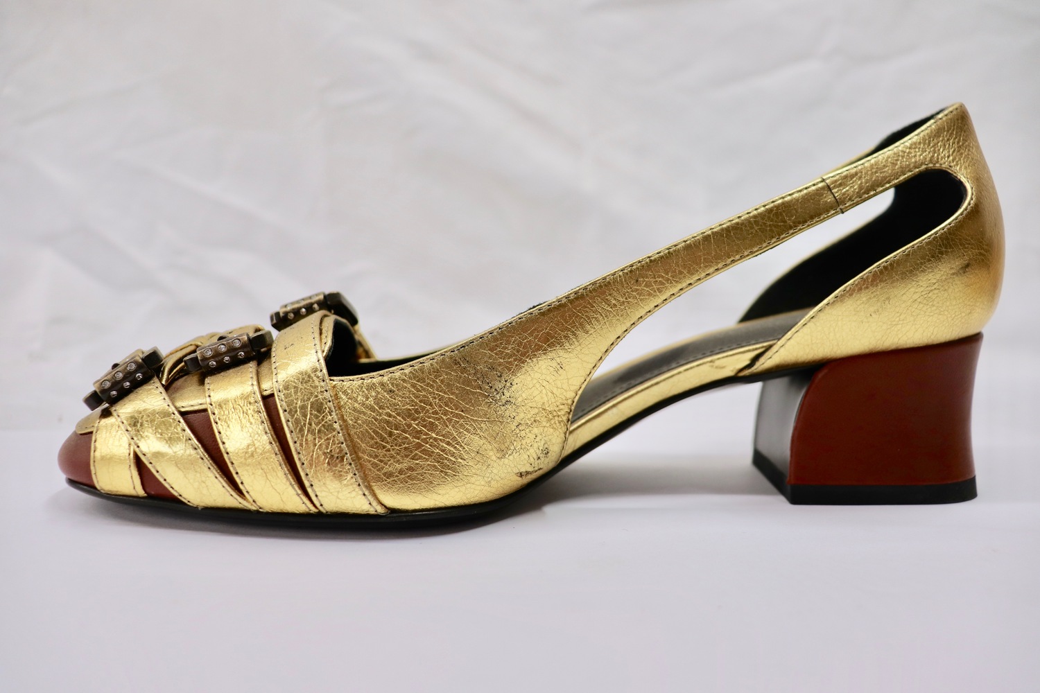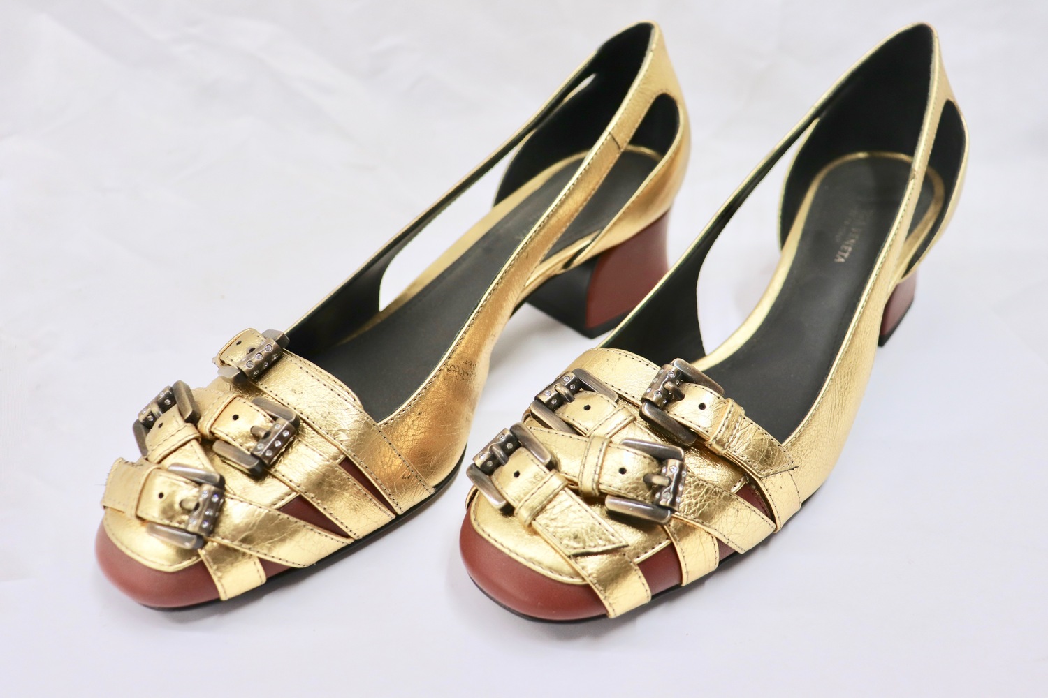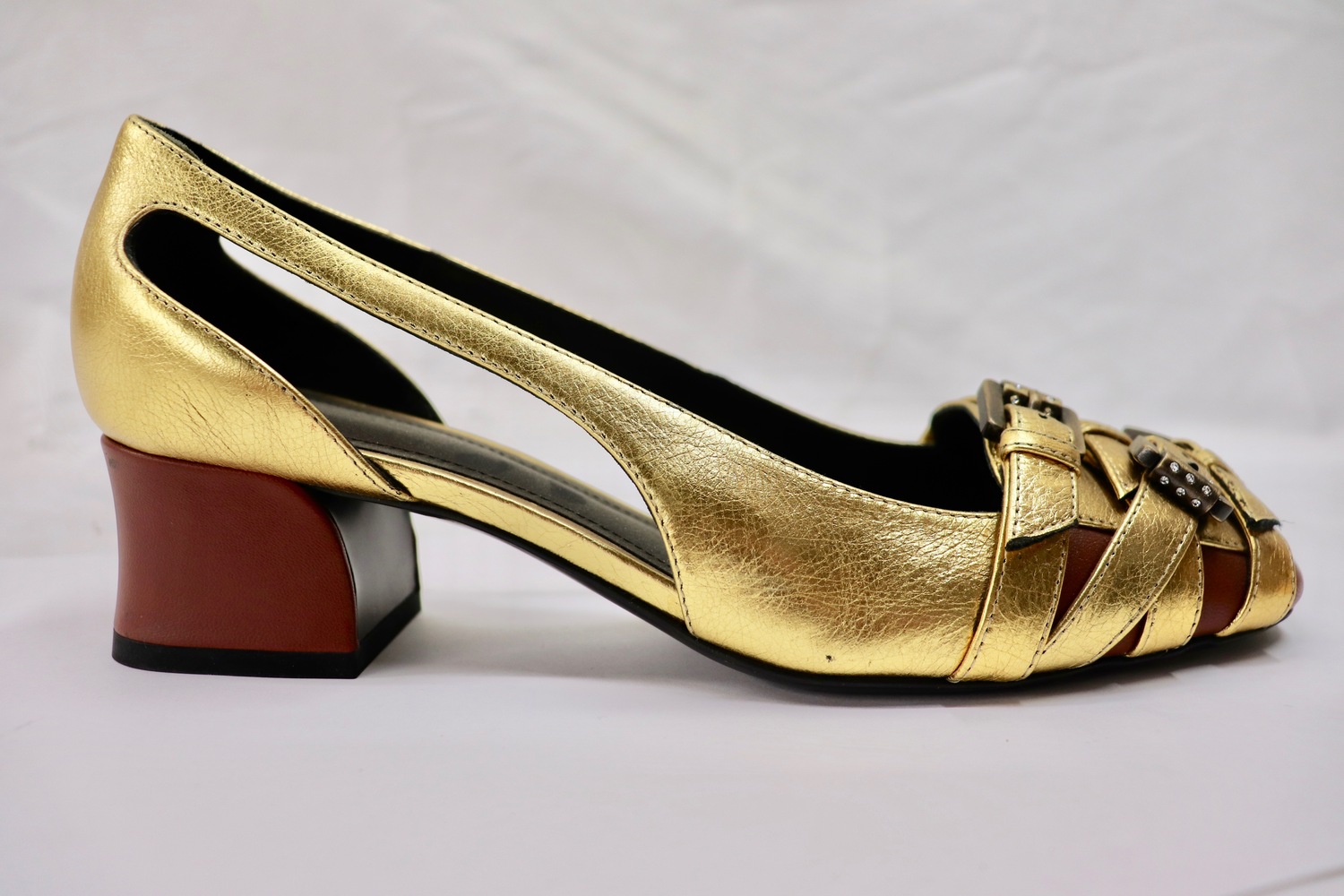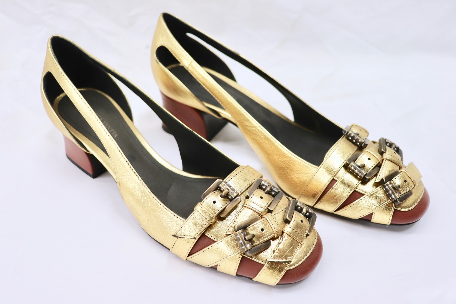 Striking Bottega Veneta pumps crafted in metallic gold leather with multi-buckle detailing and a sculpted low heel. Elegant, architectural, and unmistakably Italian luxury.