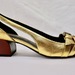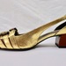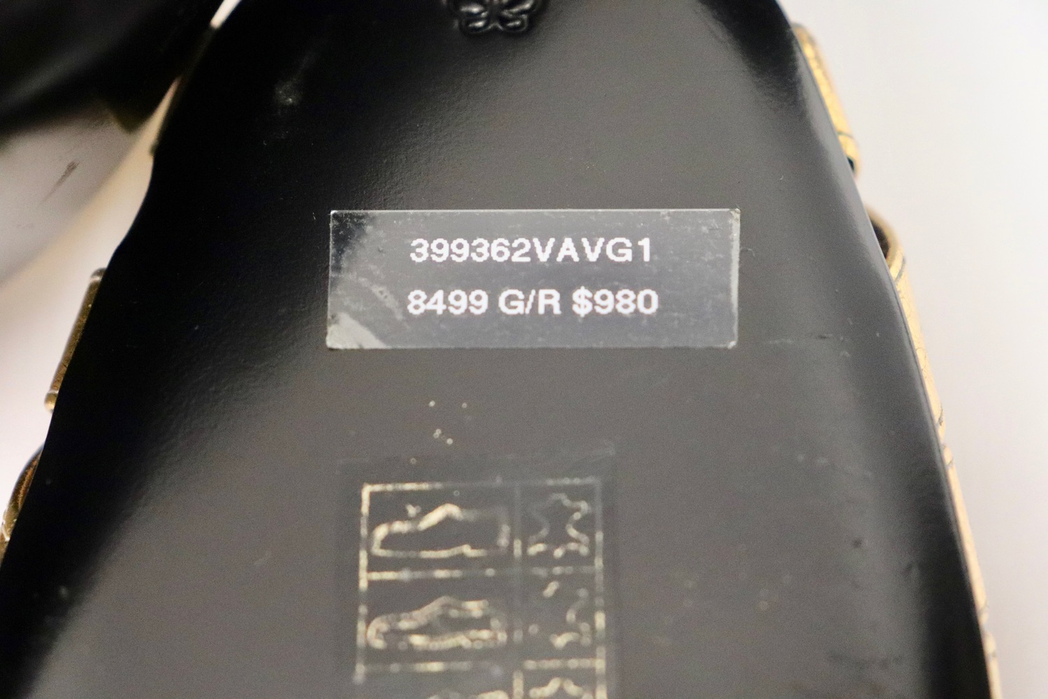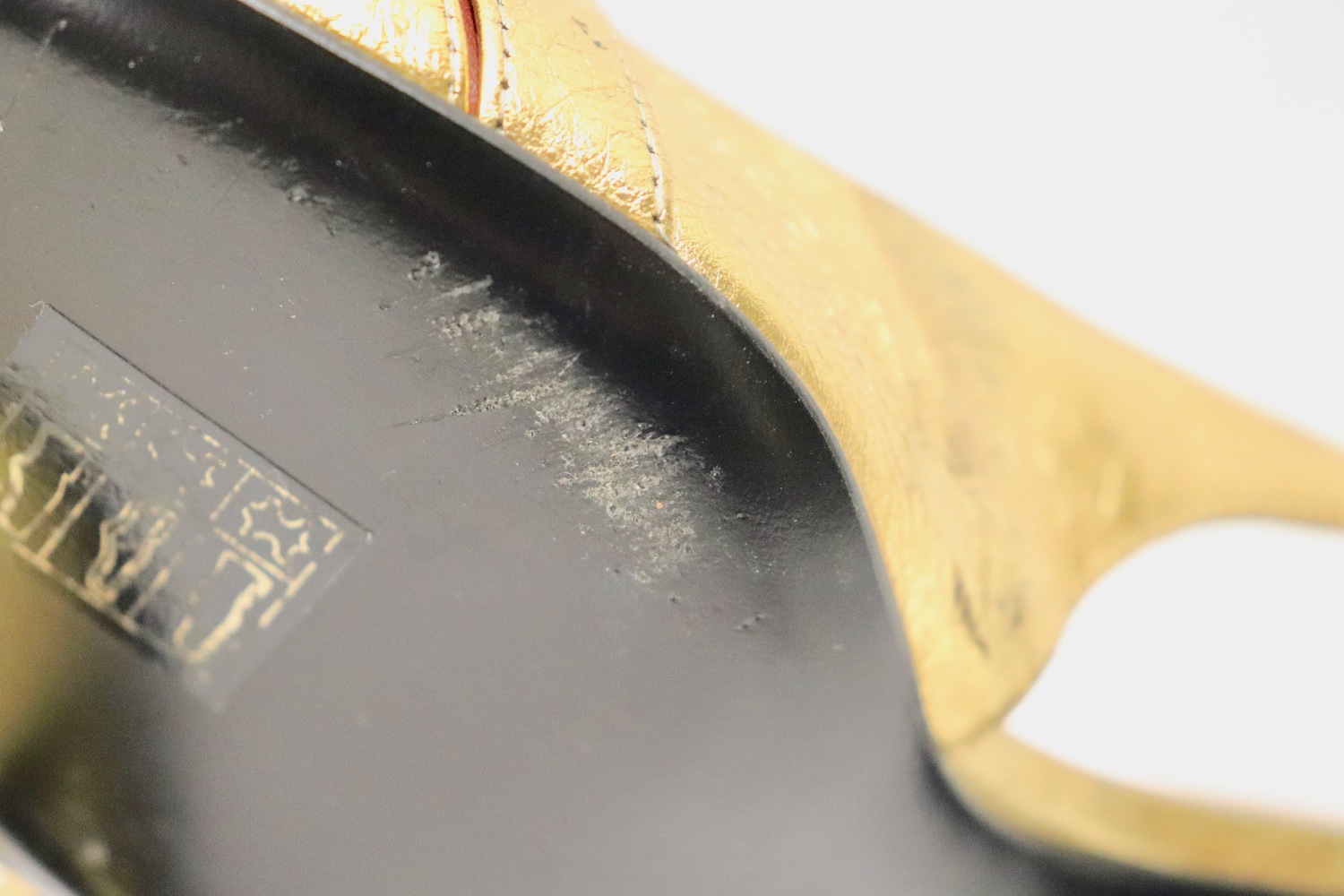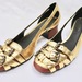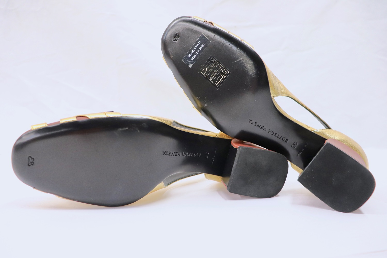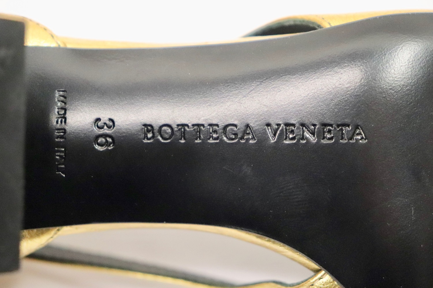 Striking Bottega Veneta pumps crafted in metallic gold leather with multi-buckle detailing and a sculpted low heel. Elegant, architectural, and unmistakably Italian luxury.