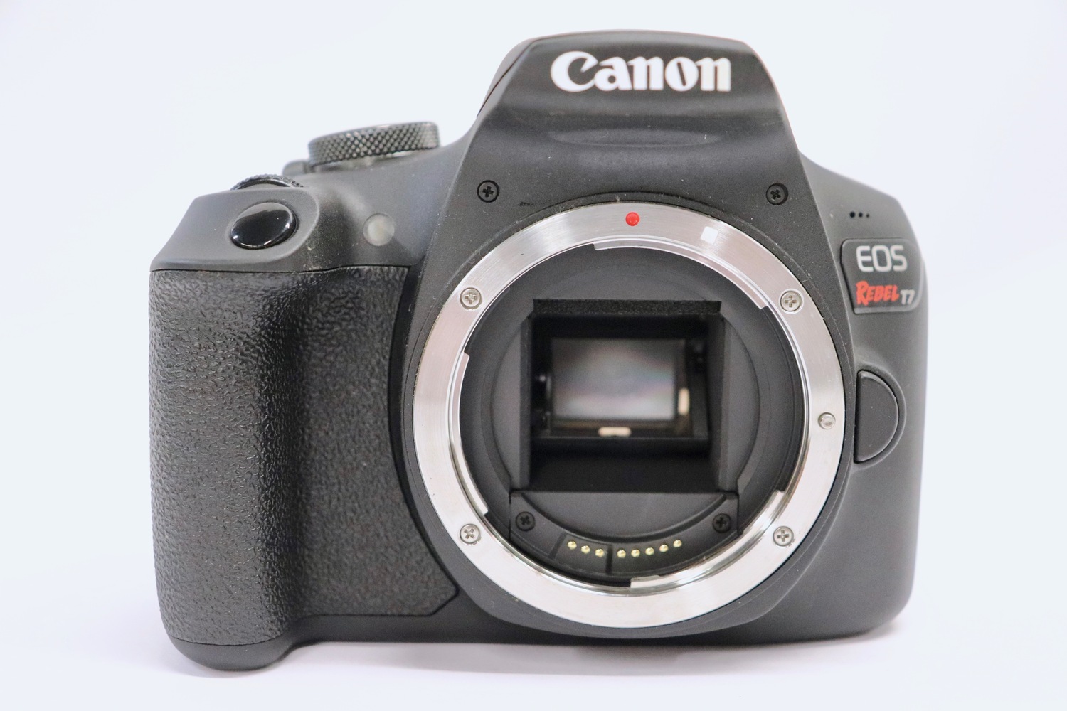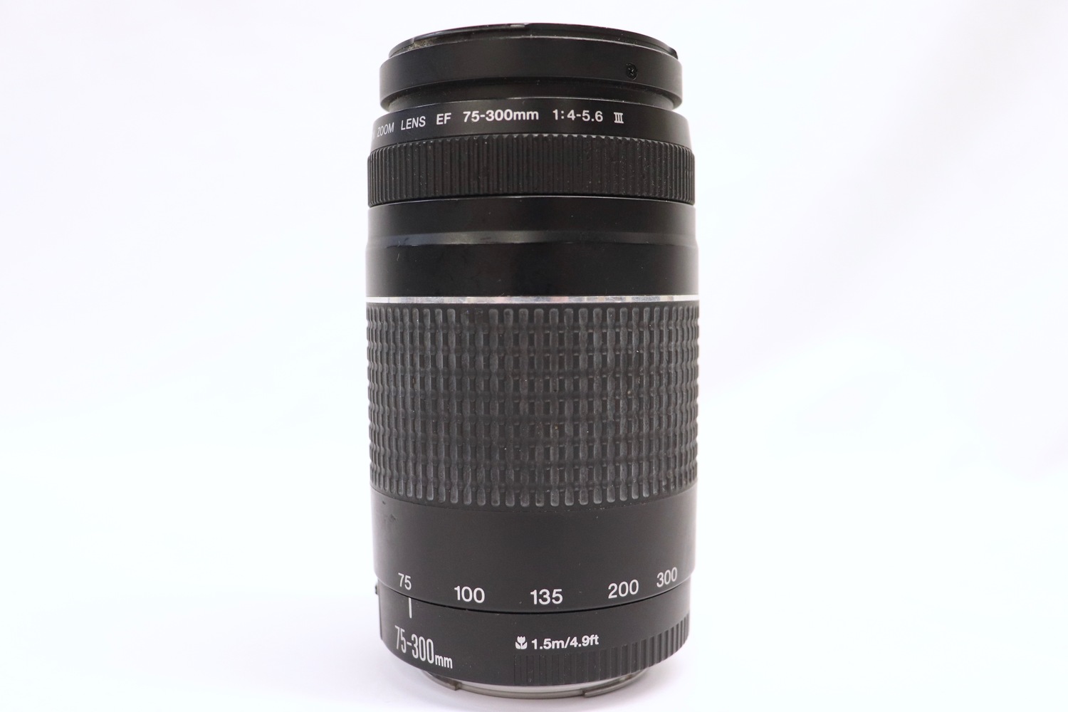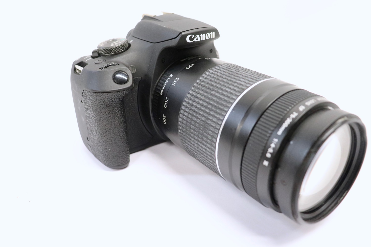 Canon Rebel T7 DSLR camera paired with a Canon 75-300mm zoom lens. The camera body is in excellent condition with very light handling wear only. Screen is clean and clear with no scratches or scuffs. Fully tested and working as it should.
