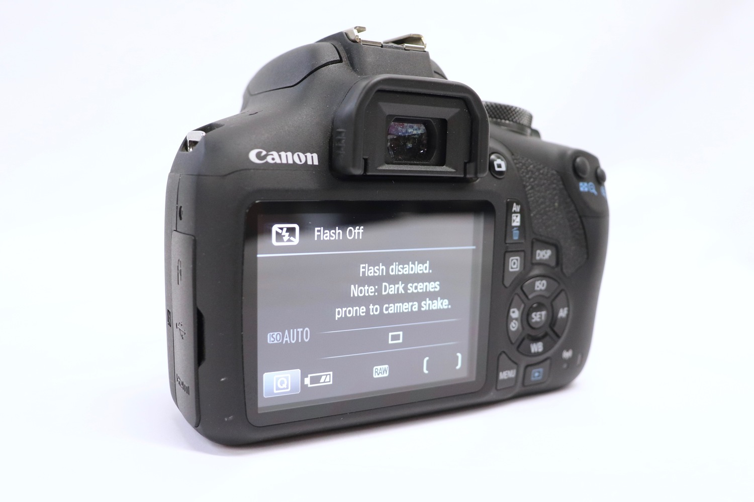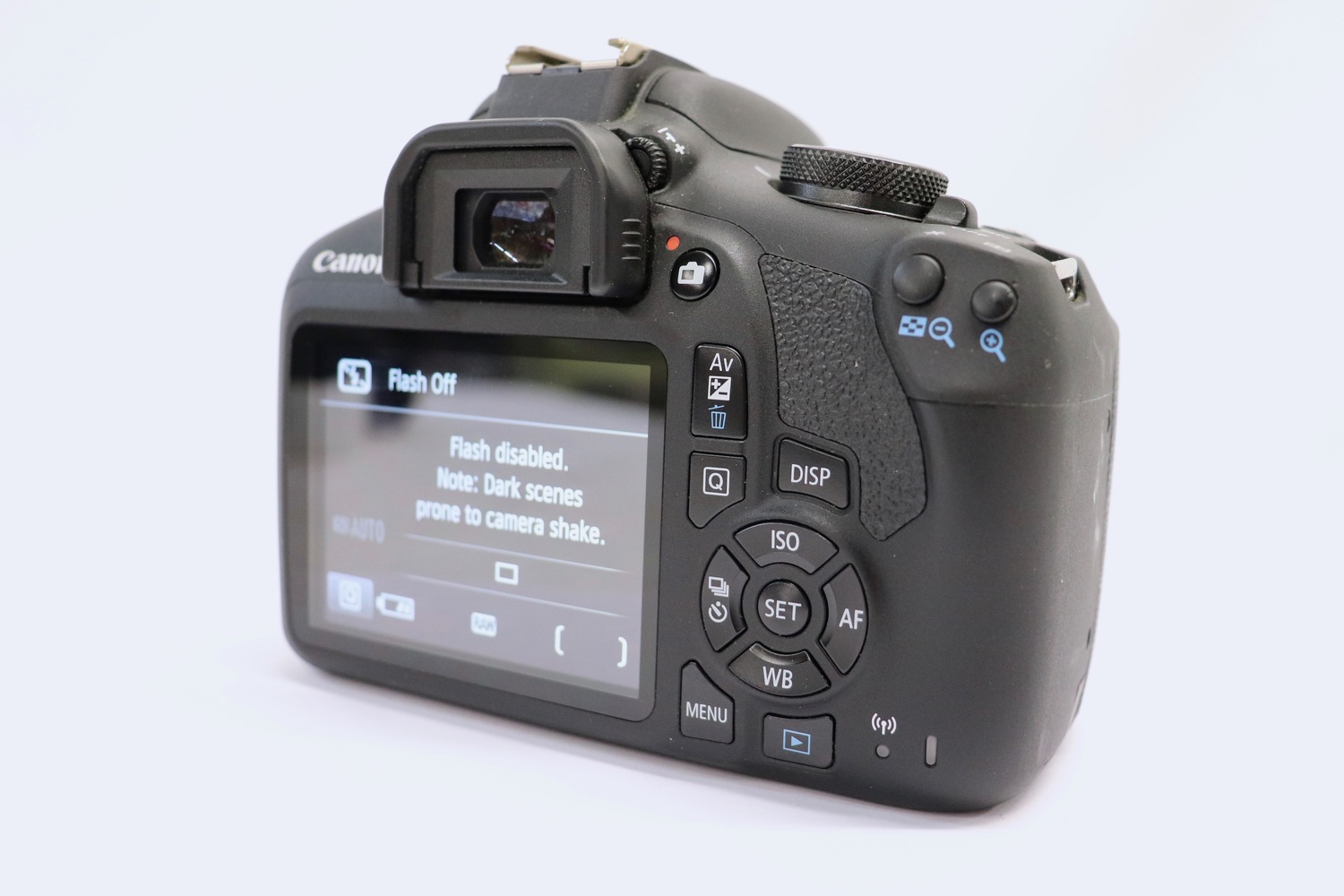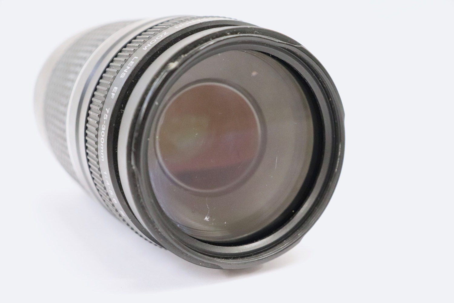 Canon Rebel T7 DSLR camera paired with a Canon 75-300mm zoom lens. The camera body is in excellent condition with very light handling wear only. Screen is clean and clear with no scratches or scuffs. Fully tested and working as it should.