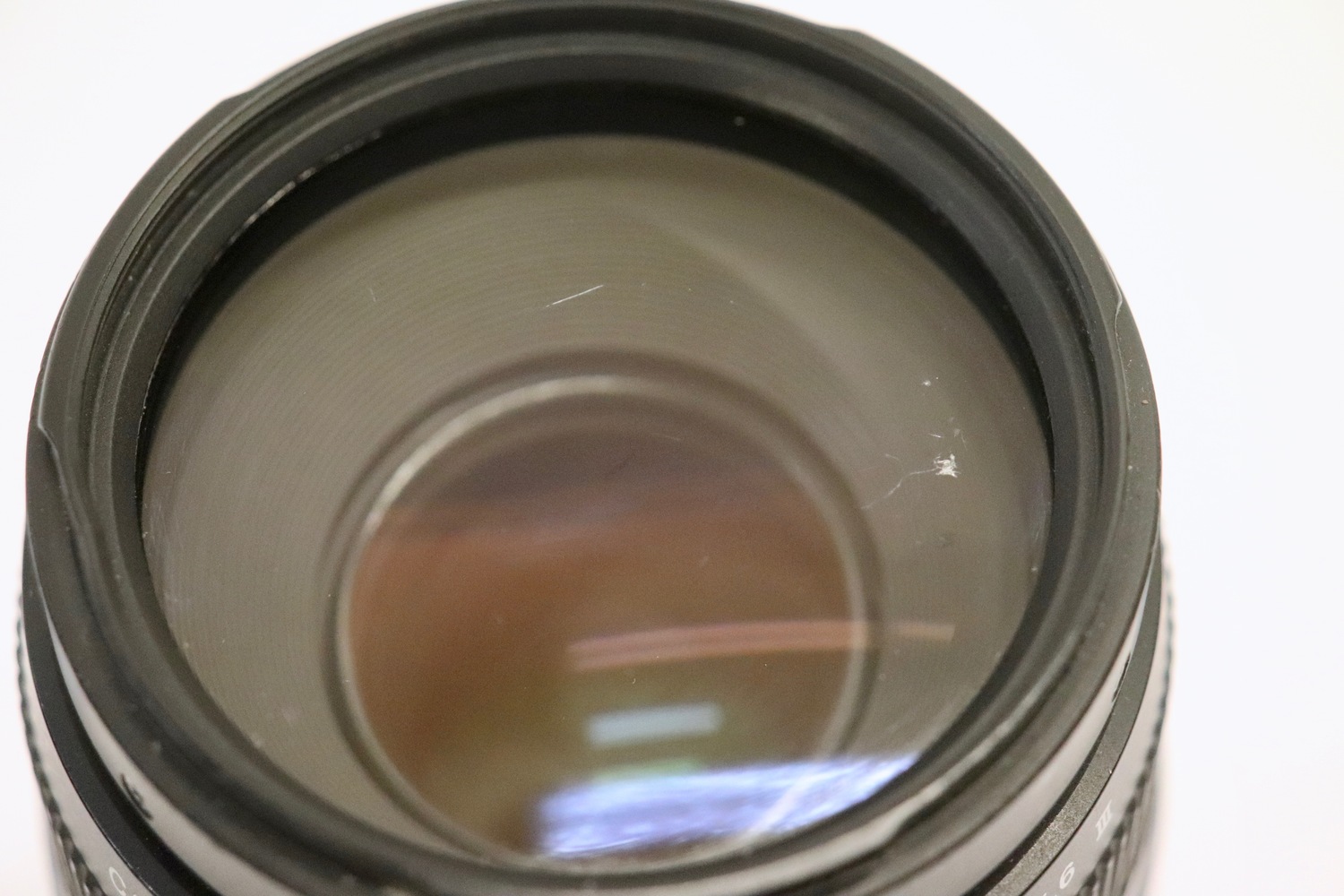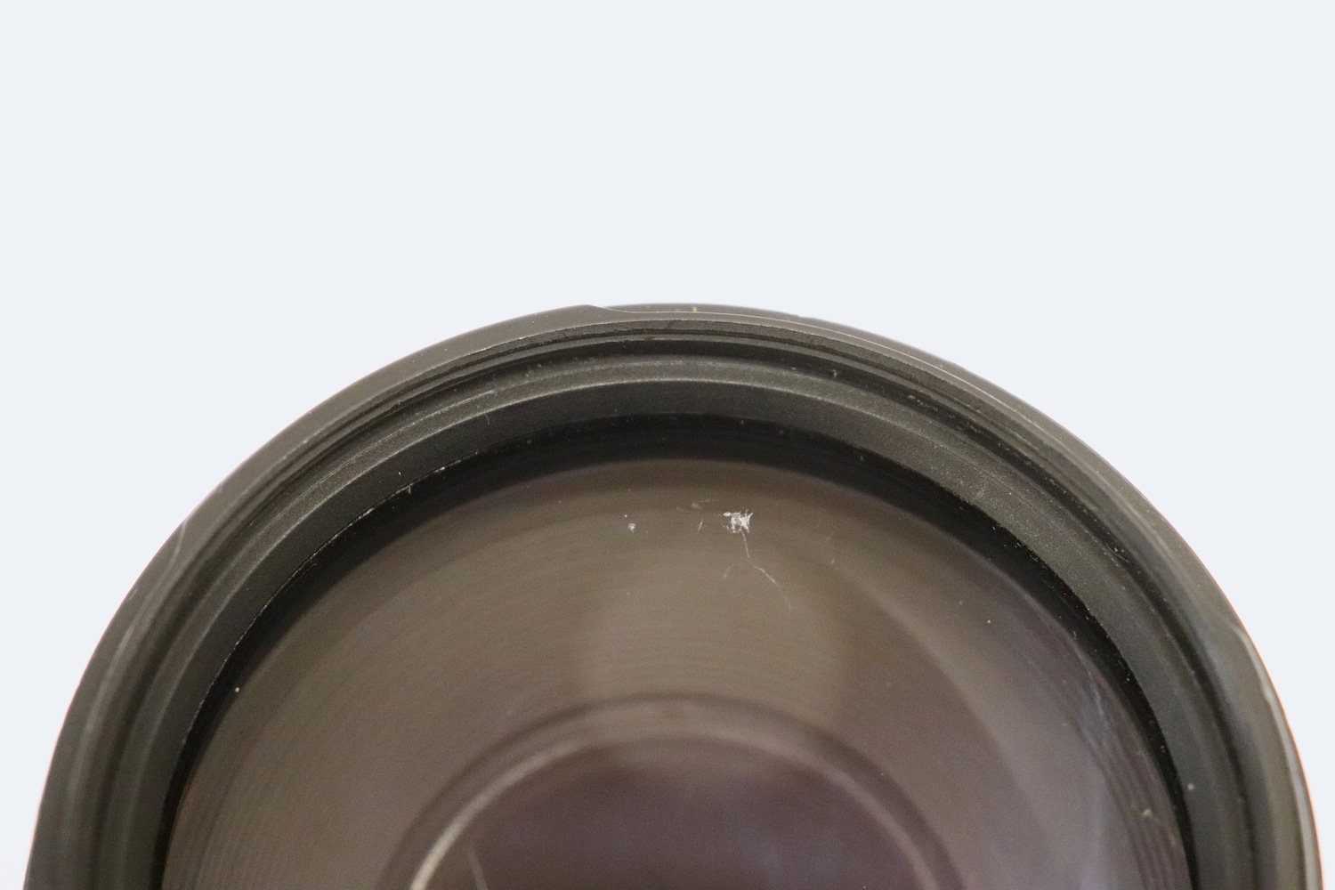 The lens functions properly but does have cosmetic wear to the front element, including several small nicks/scratches- one of which can be felt with a fingernail. This has been fully disclosed and shown in photos.