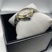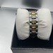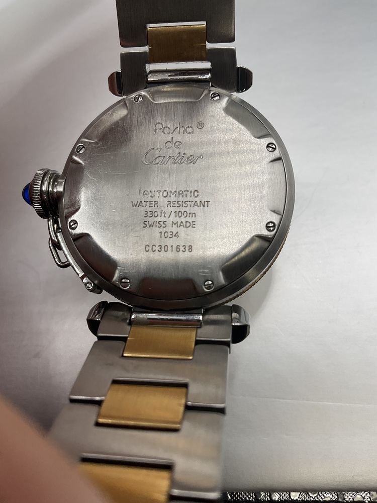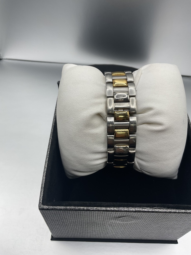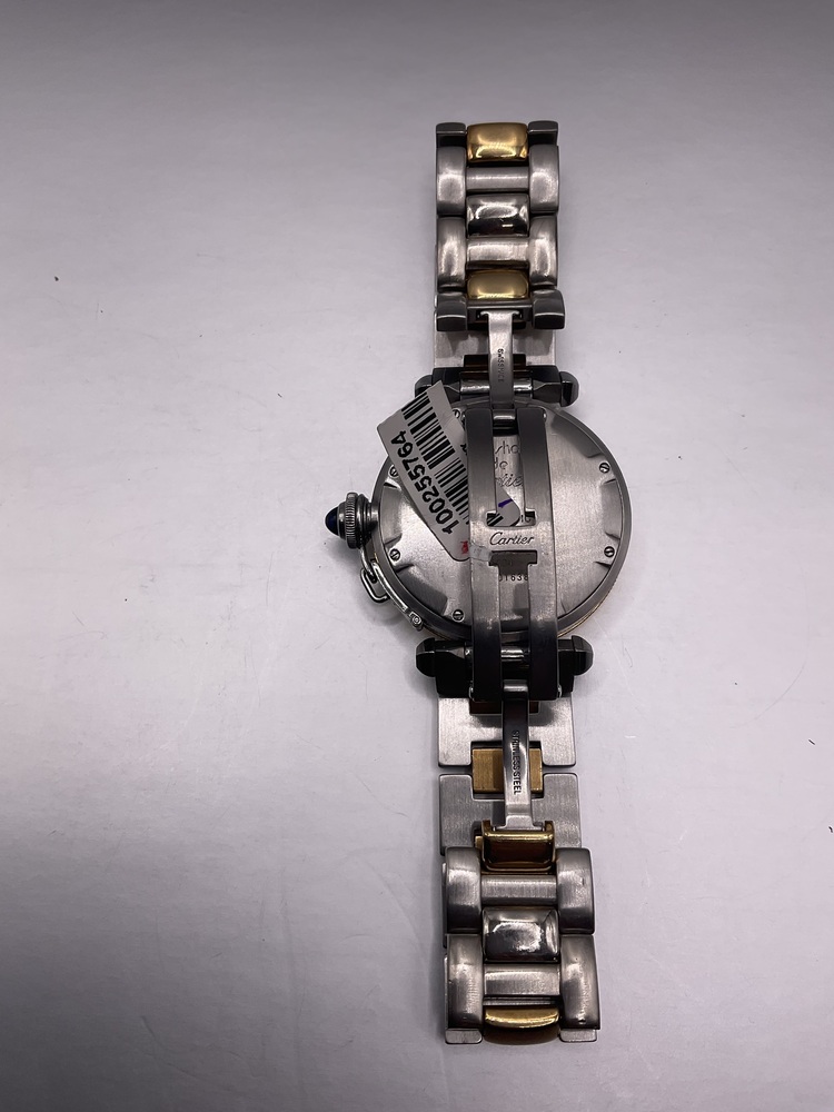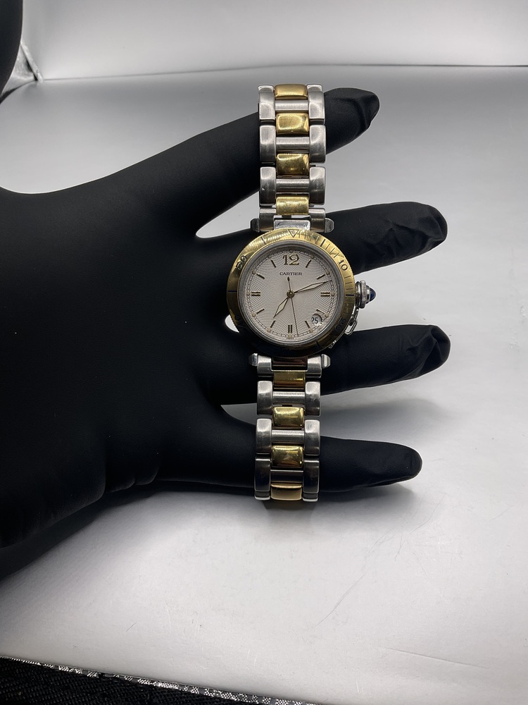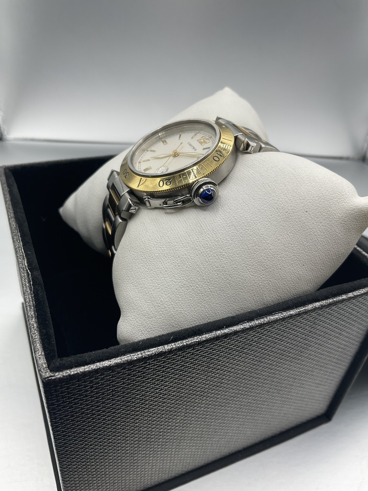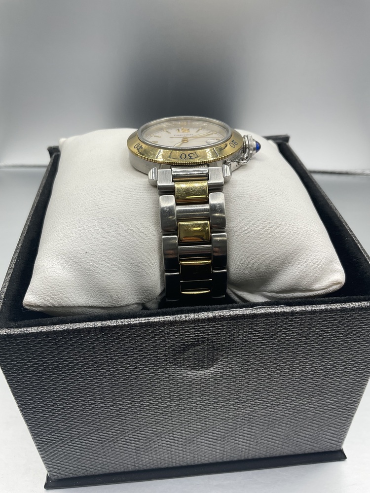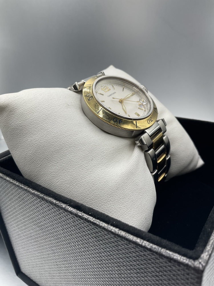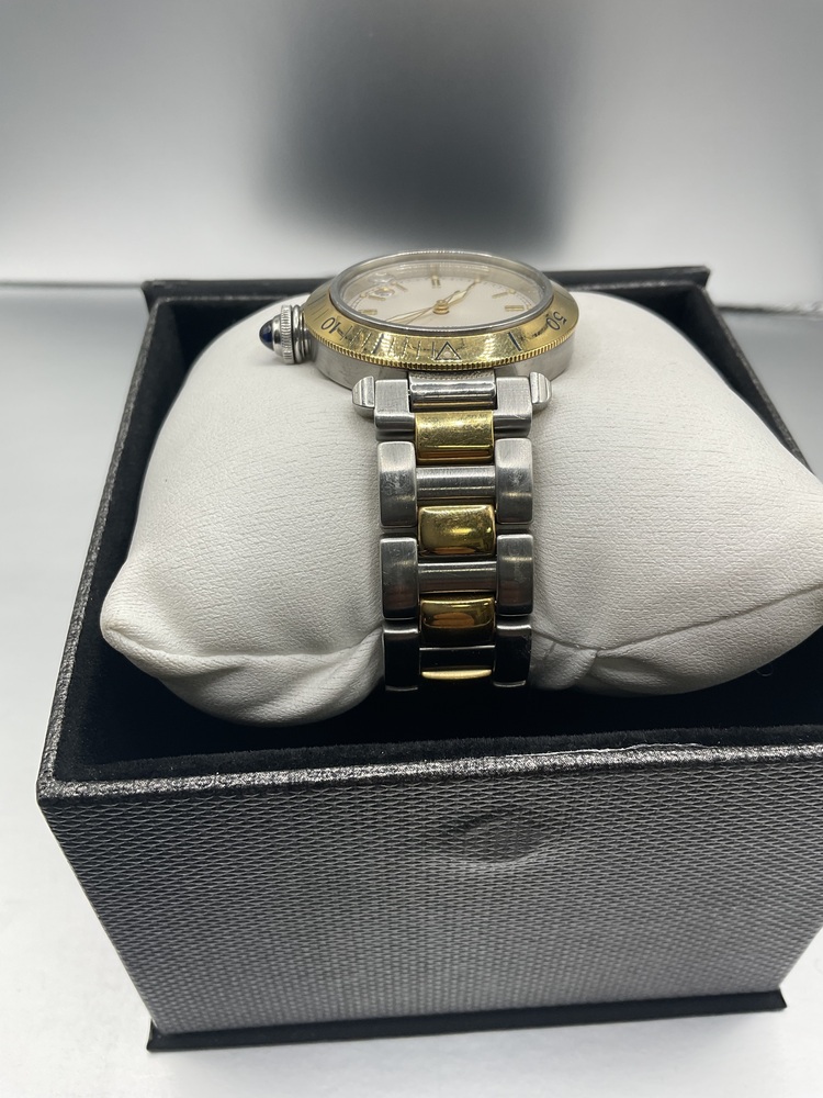 Elegant two-tone Cartier watch features a stainless steel and 18 kt band with a classic white dial. Crafted for style, precision, and timeless sophistication.