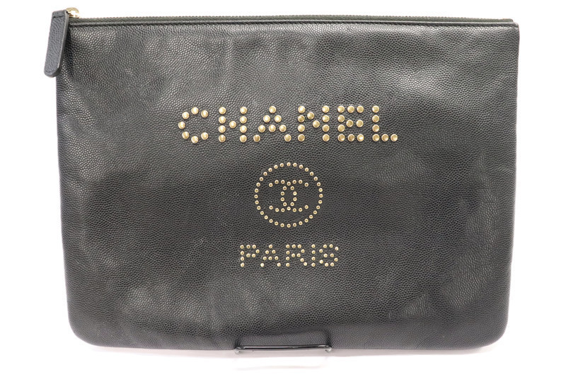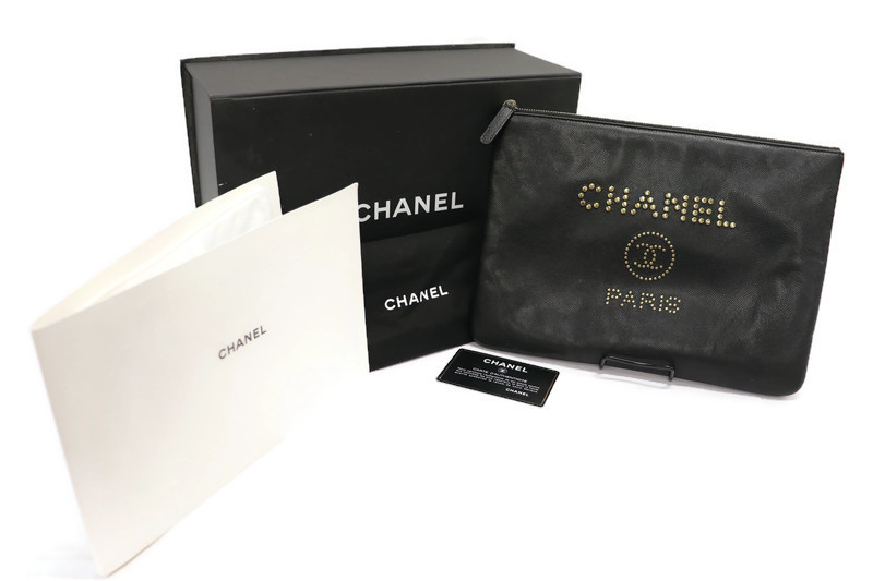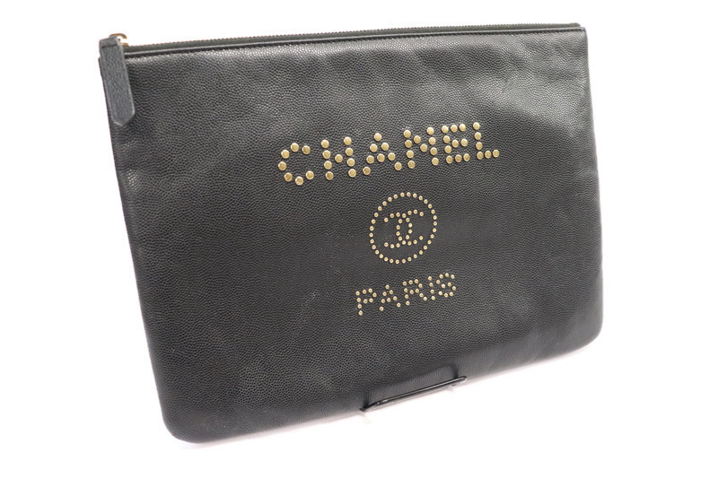 Bold studded CHANEL statement piece- clutch format, full accessories, solid value.