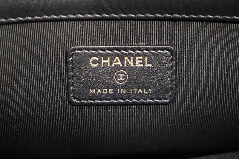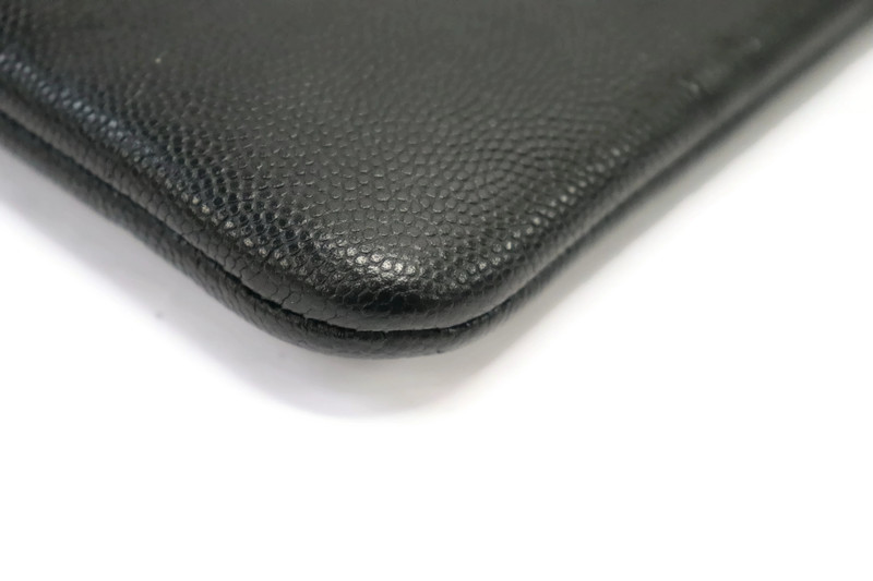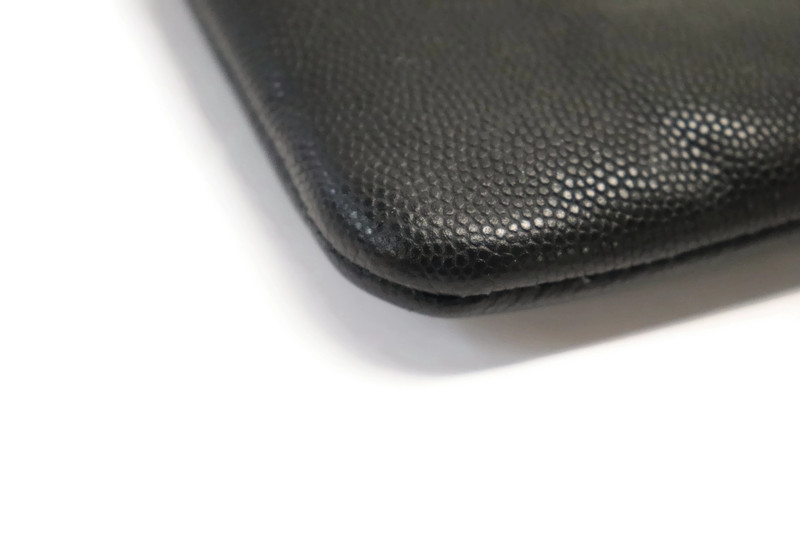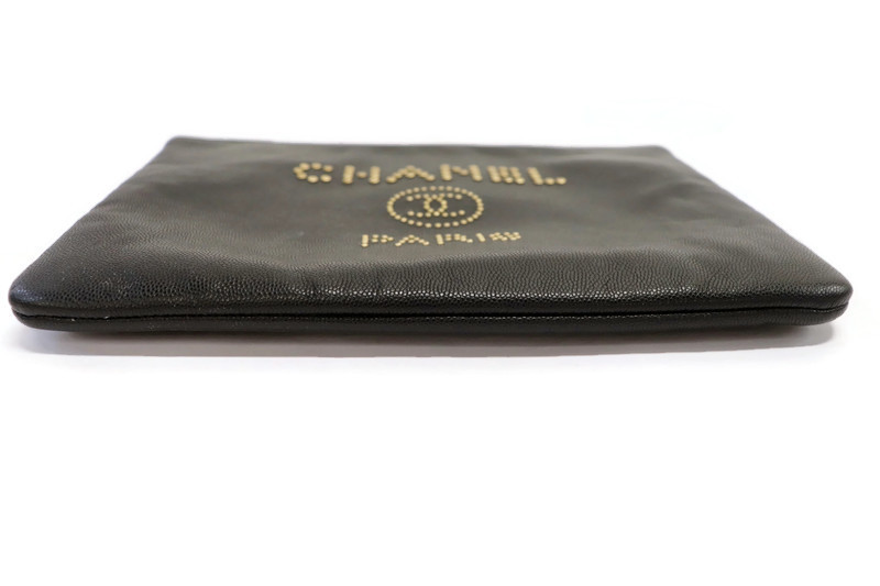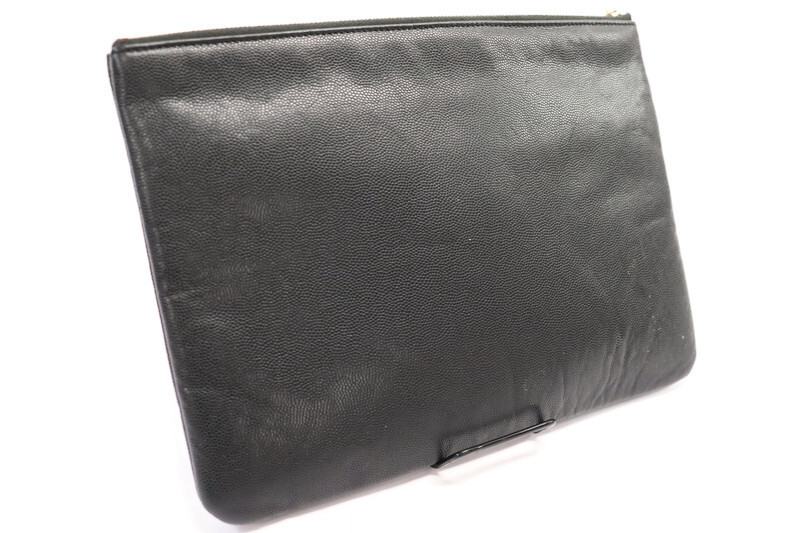 Here’s an authentic CHANEL clutch/pouch crafted in black grained leather, featuring a studded “CHANEL” logo on the front and matte gold hardware. This piece is in very good pre-owned condition: the leather is soft and supple with natural creasing from use; the interior is clean and odor-free; it includes boxed packaging, authentication card and accessories. With its sleek format (approx. 10.5″ × 8″ × 0.25″), this chic clutch offers high-style utility and preloved savings.