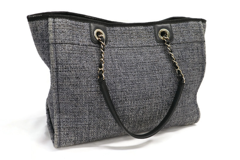 The Chanel Deauville MM Straw Tote embodies casual sophistication with its woven navy exterior, chain-and-leather handles, and bold front logo graphic. Spacious yet lightweight, it’s perfect for elevated everyday wear or chic resort style.