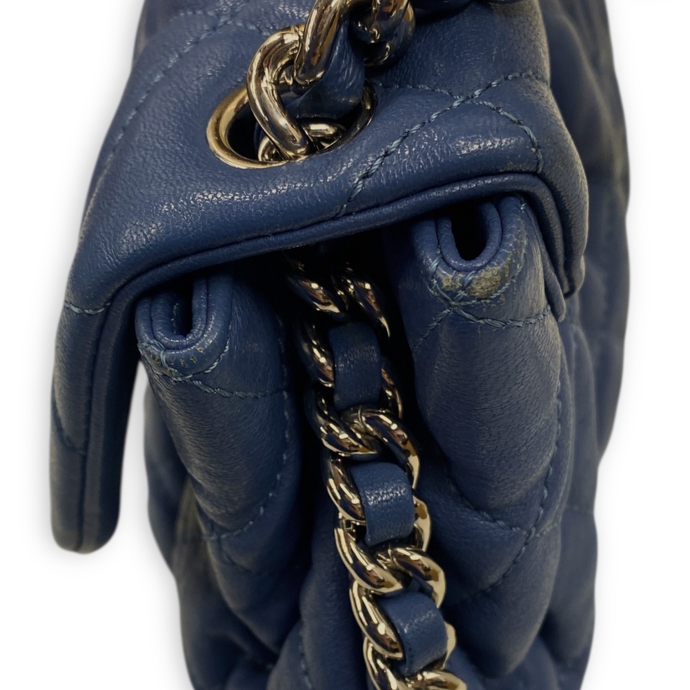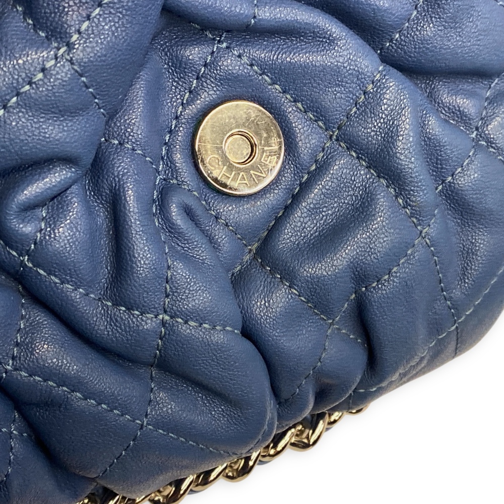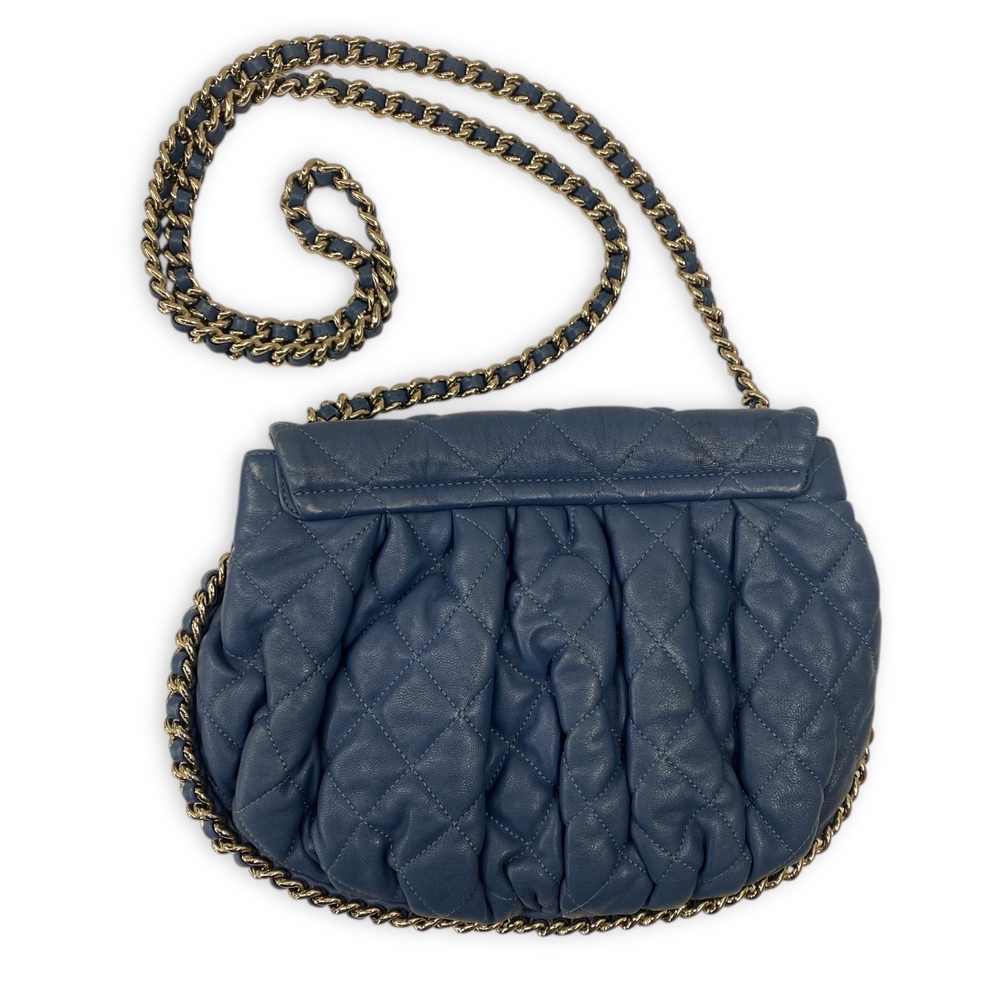 Discover a truly exceptional Chanel piece — a beautifully crafted quilted lambskin flap bag in an elegant blue tone, framed with a leather-interwoven chain trim that defines the silhouette. This refined and uncommon design offers a sophisticated blend of softness, structure, and couture detailing, making it ideal for the collector who seeks exclusivity beyond the classic lineup.