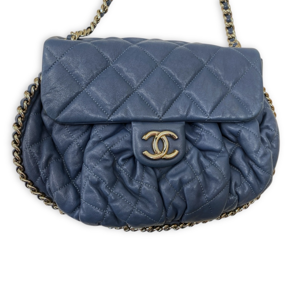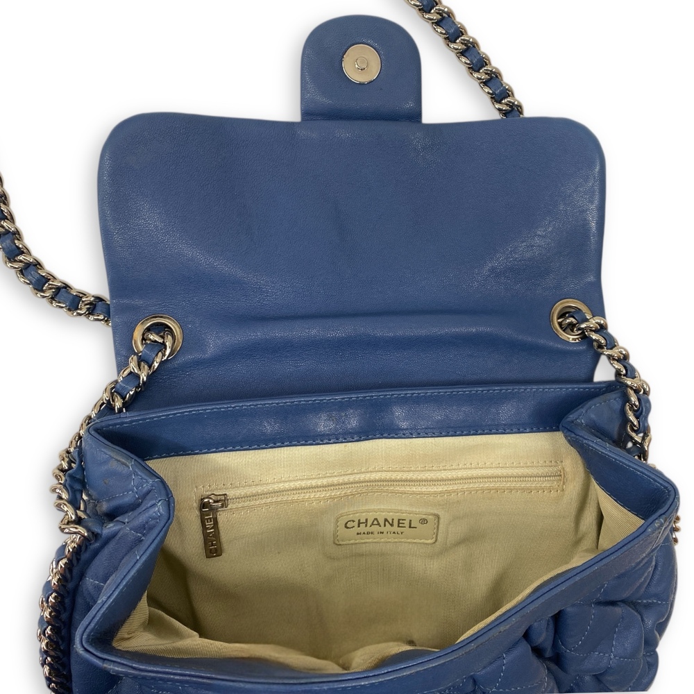Discover a truly exceptional Chanel piece — a beautifully crafted quilted lambskin flap bag in an elegant blue tone, framed with a leather-interwoven chain trim that defines the silhouette. This refined and uncommon design offers a sophisticated blend of softness, structure, and couture detailing, making it ideal for the collector who seeks exclusivity beyond the classic lineup.