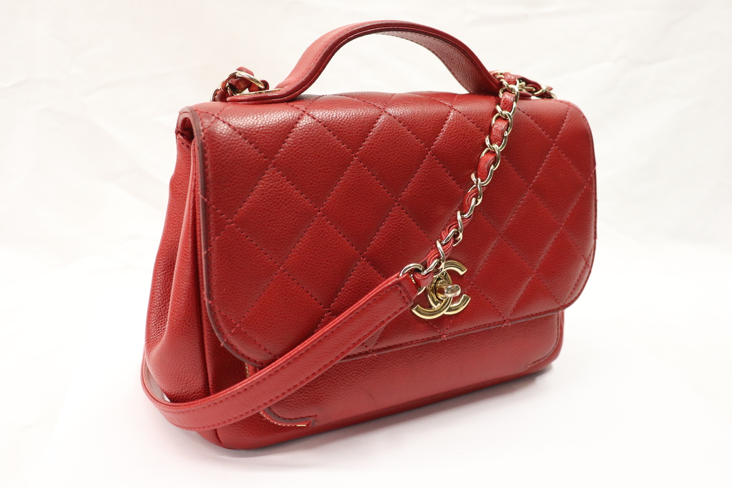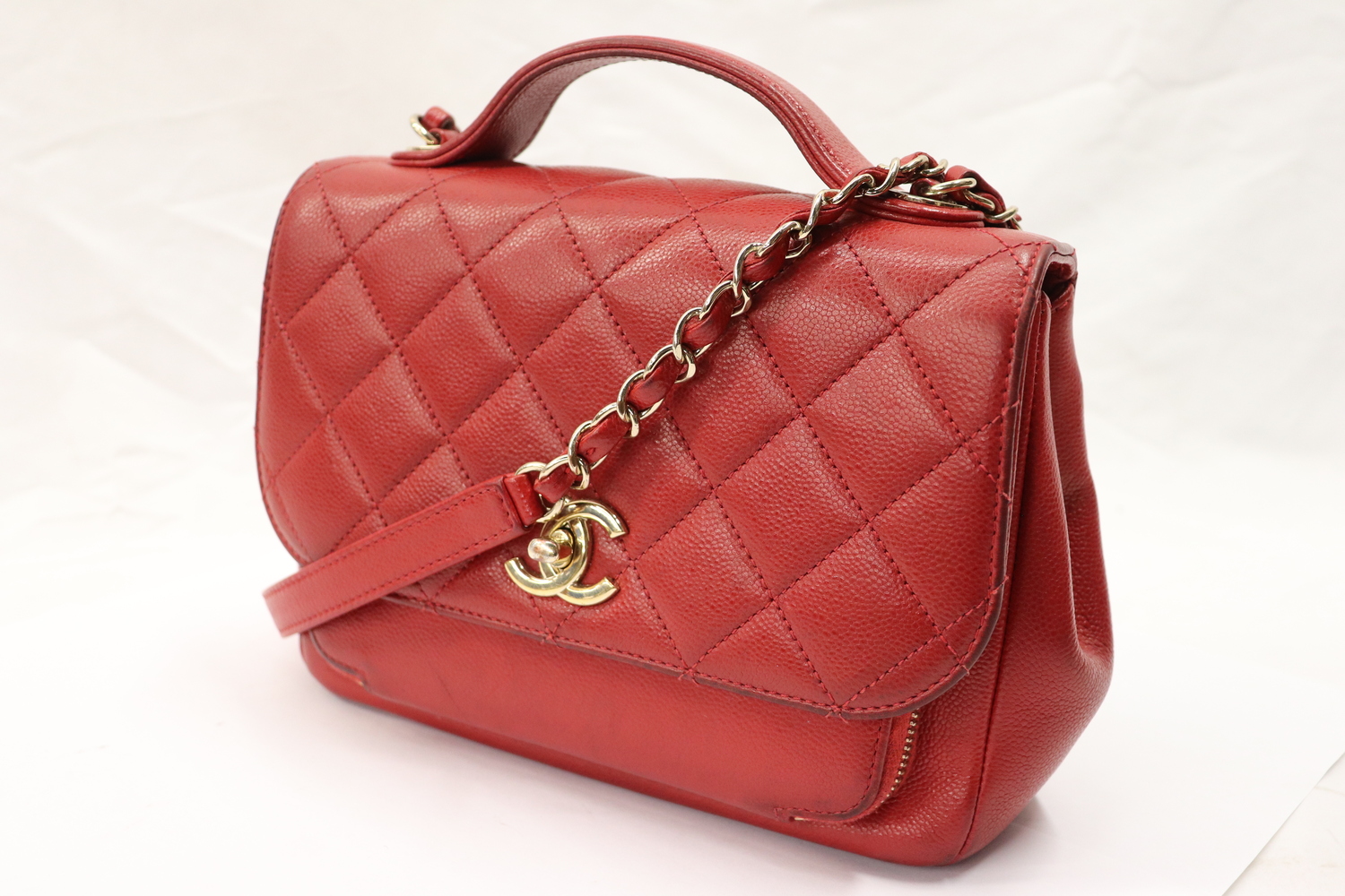 Authentic Chanel Small Business Affinity Flap Bag crafted in red caviar leather with quilted stitching, top handle, and chain shoulder strap. A structured, iconic Chanel silhouette with everyday versatility.