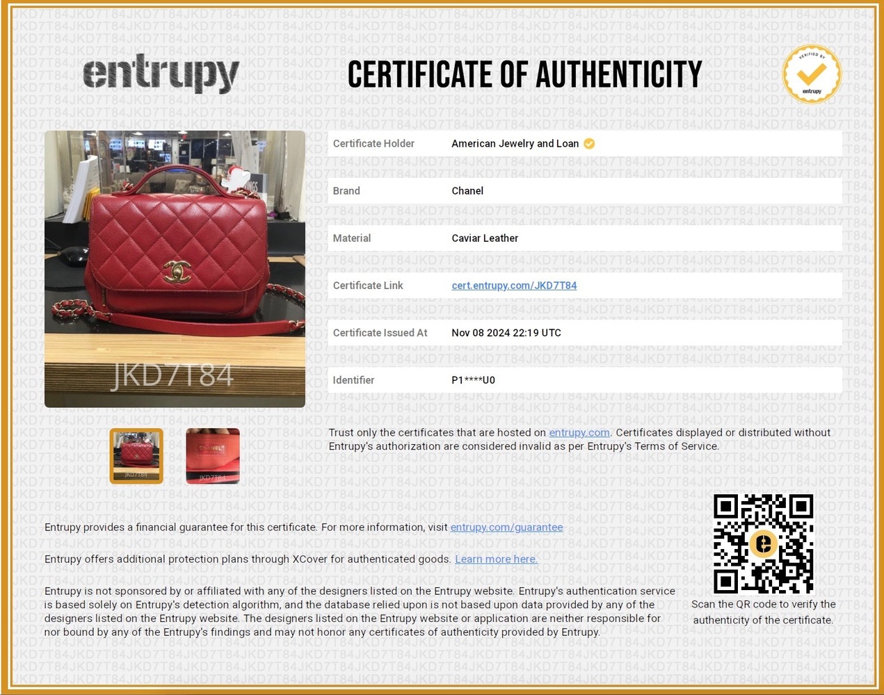 • Entrupy Certificate of Authenticity