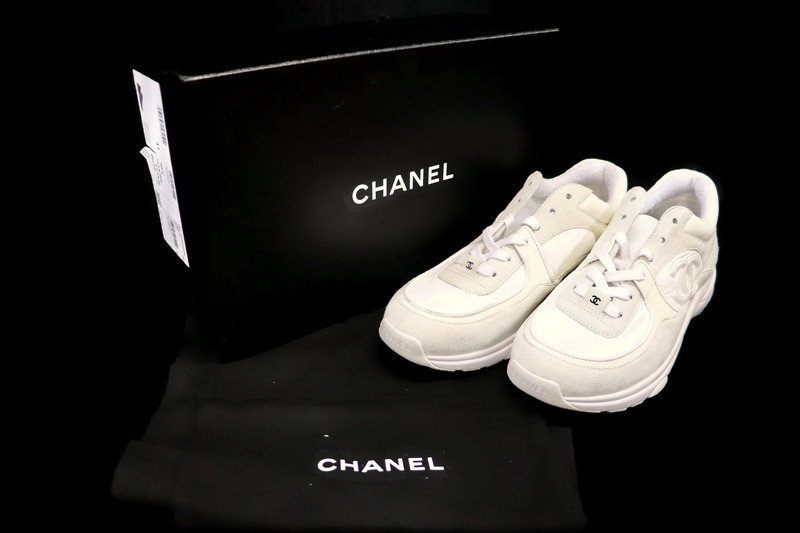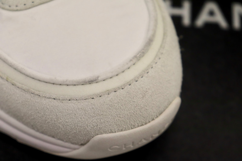 Refined, versatile, and unmistakably Chanel. These sneakers feature a luxurious combination of white suede and soft mixed-fabric panels with the signature interlocking CC logo at the sides. The silhouette blends sport-luxe styling with elevated craftsmanship- comfortable enough for everyday wear yet stylish enough for any casual-chic look.