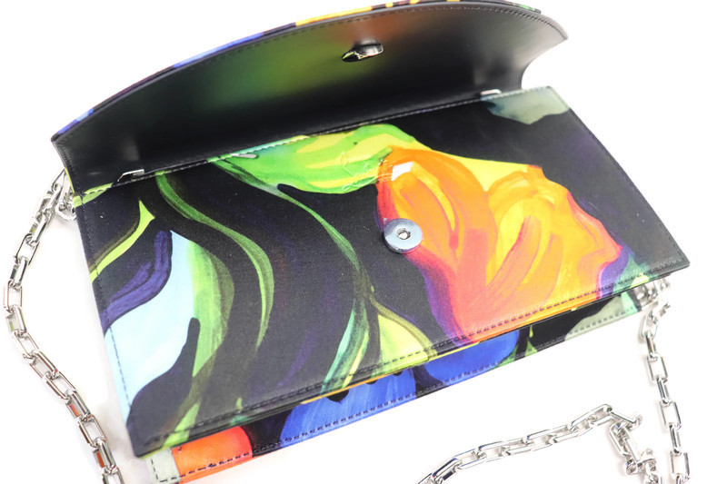 A striking and vibrant Christian Louboutin Loubi54 satin floral chain bag featuring a bold multicolor print and polished silver-tone “CL” logo hardware. This piece is unused, with the protective plastic still on the emblem and protective wrap on the chain. Interior is pristine, bright red, and flawless. Comes complete with original tags, care booklet, and dust bag. A grail-level accessory for collectors and couture lovers alike.