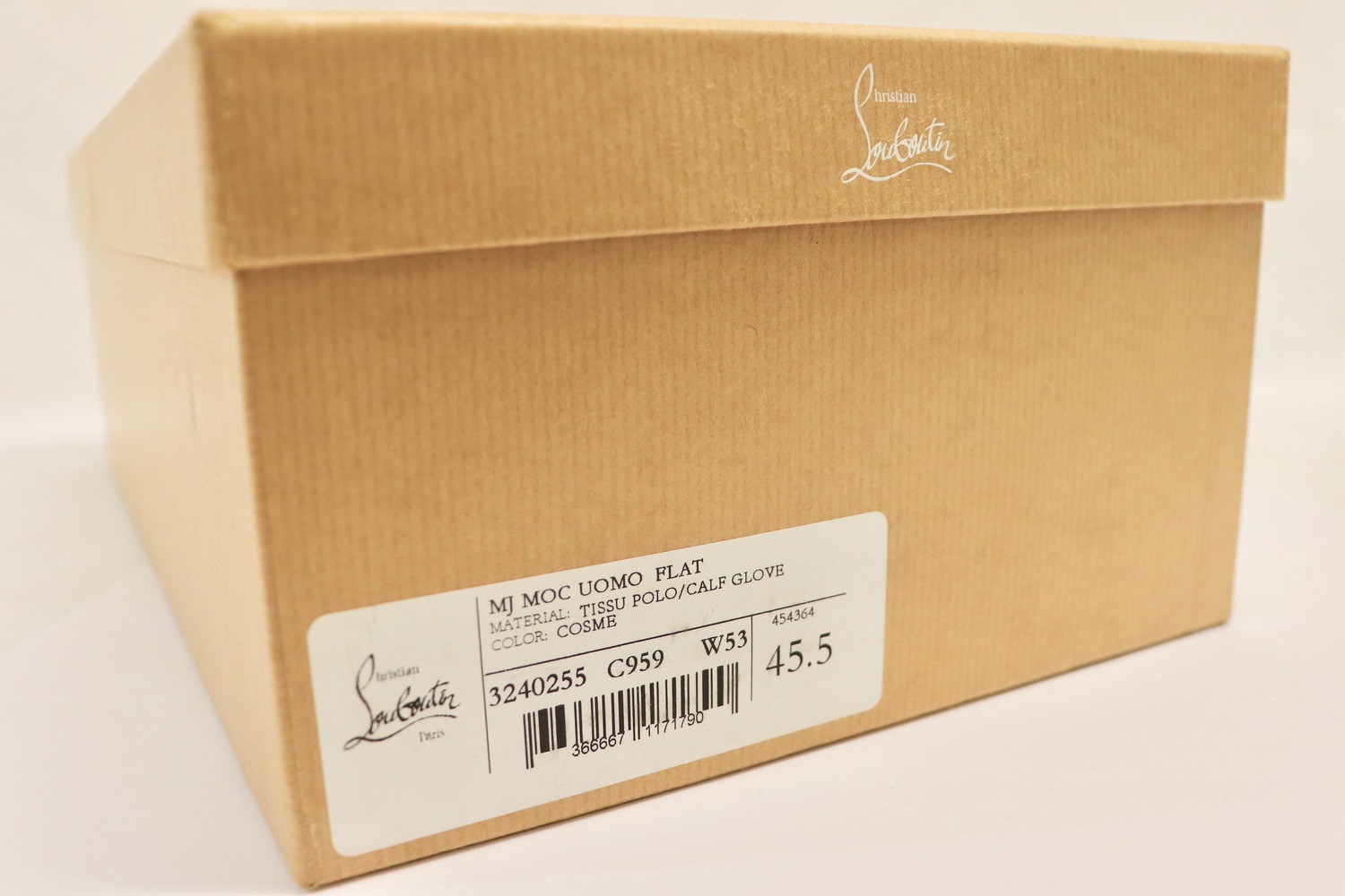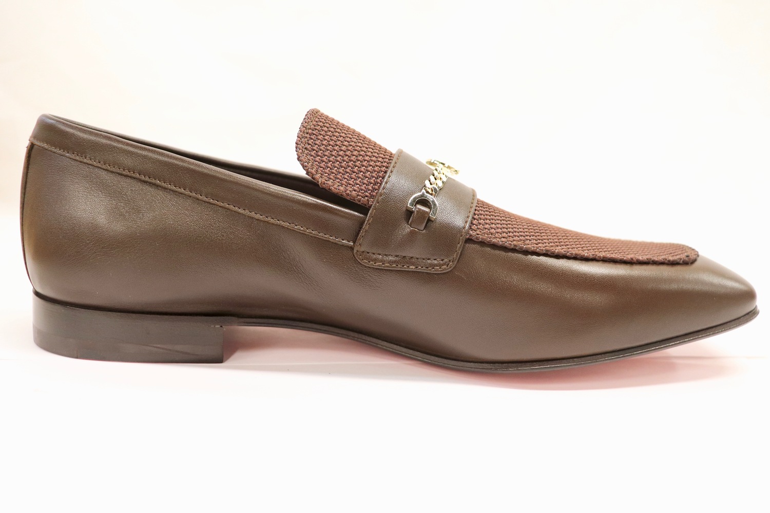 A refined men’s loafer that brings signature Louboutin flair to classic tailoring. The MJ Moc Uomo Flat features a rich brown “Cosme” colorway in supple calf glove leather and textured polo fabric. Finished with a silver-tone chain detail and the instantly recognizable red lacquered sole. Unmistakably luxurious, effortlessly suave.