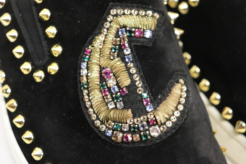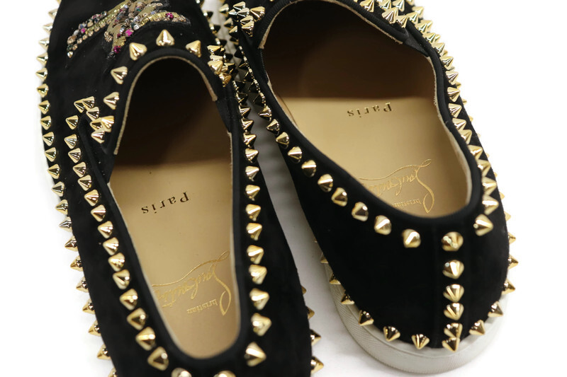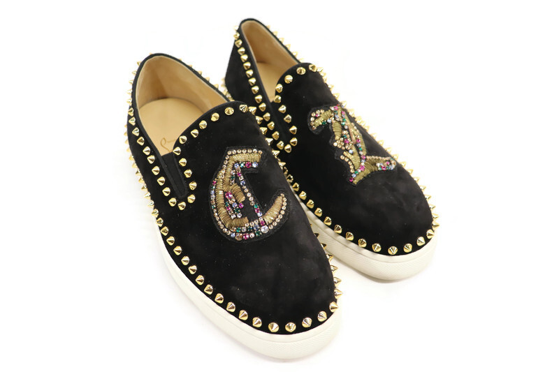 Turn heads with these rare and absolutely stunning Christian Louboutin Pik Boat Slip-On Sneakers, featuring black suede uppers, gold-tone cone spikes, and fully embellished “C” and “L” crystal initials across each shoe. A limited-edition, high-impact design from the iconic French luxury house.