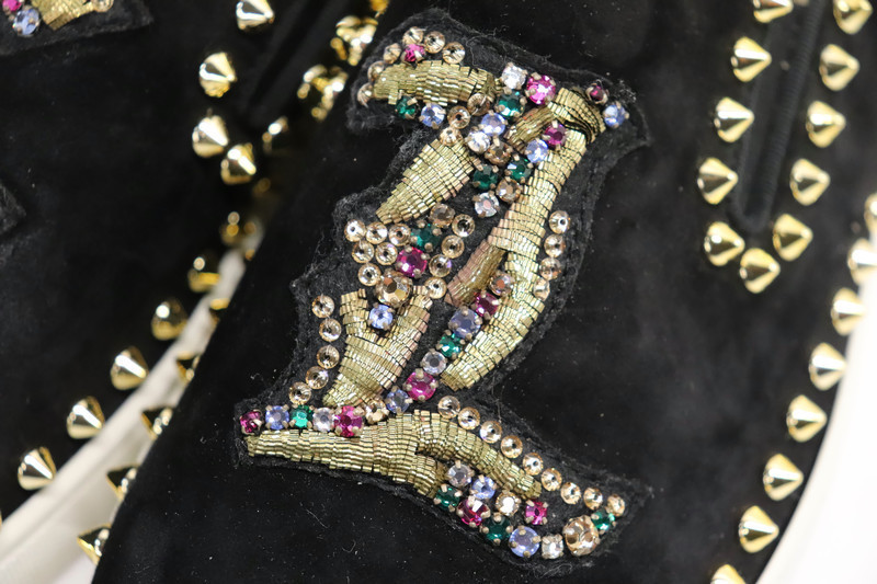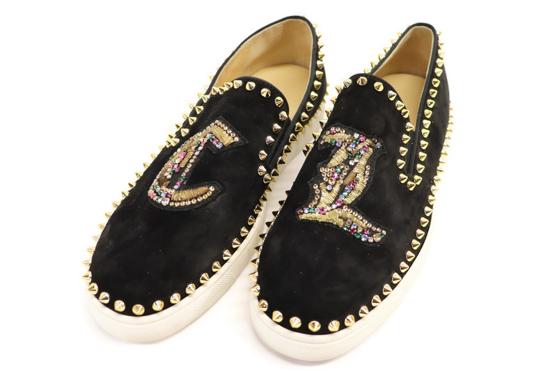 Turn heads with these rare and absolutely stunning Christian Louboutin Pik Boat Slip-On Sneakers, featuring black suede uppers, gold-tone cone spikes, and fully embellished “C” and “L” crystal initials across each shoe. A limited-edition, high-impact design from the iconic French luxury house.