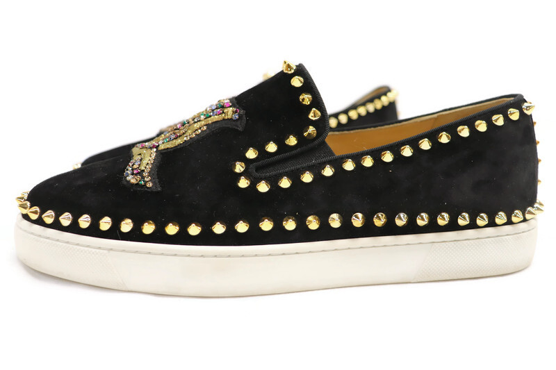 These slip-ons feature the classic Louboutin silhouette with tonal piping, padded collar, and the signature red rubber soles. The crystal monogram appliqués are vibrant, dimensional, and uniquely detailed- a collector-worthy twist on the Pik Boat style.