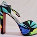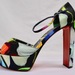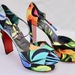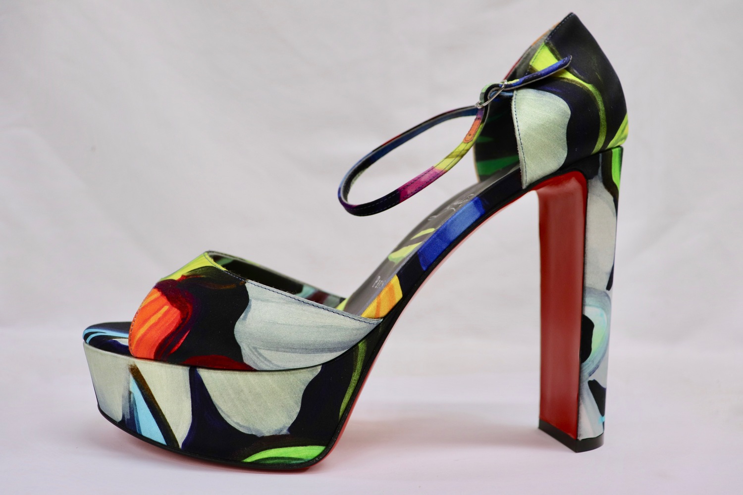 A rare, collectible Louboutin style with massive stage presence: towering heel, bold satin print, and that iconic red sole.
