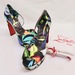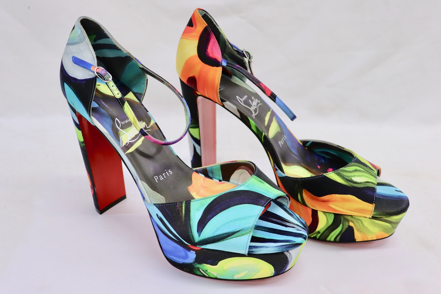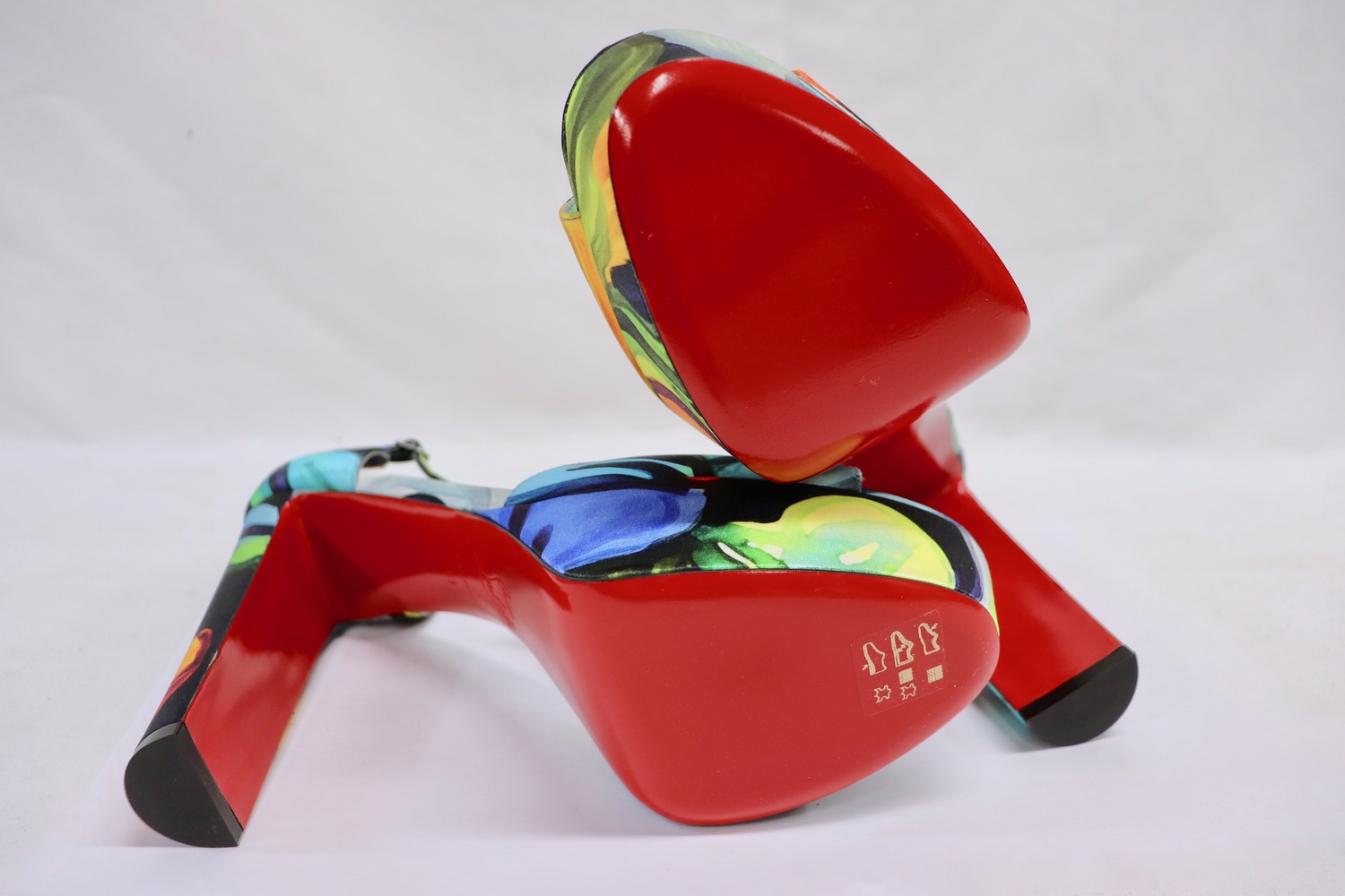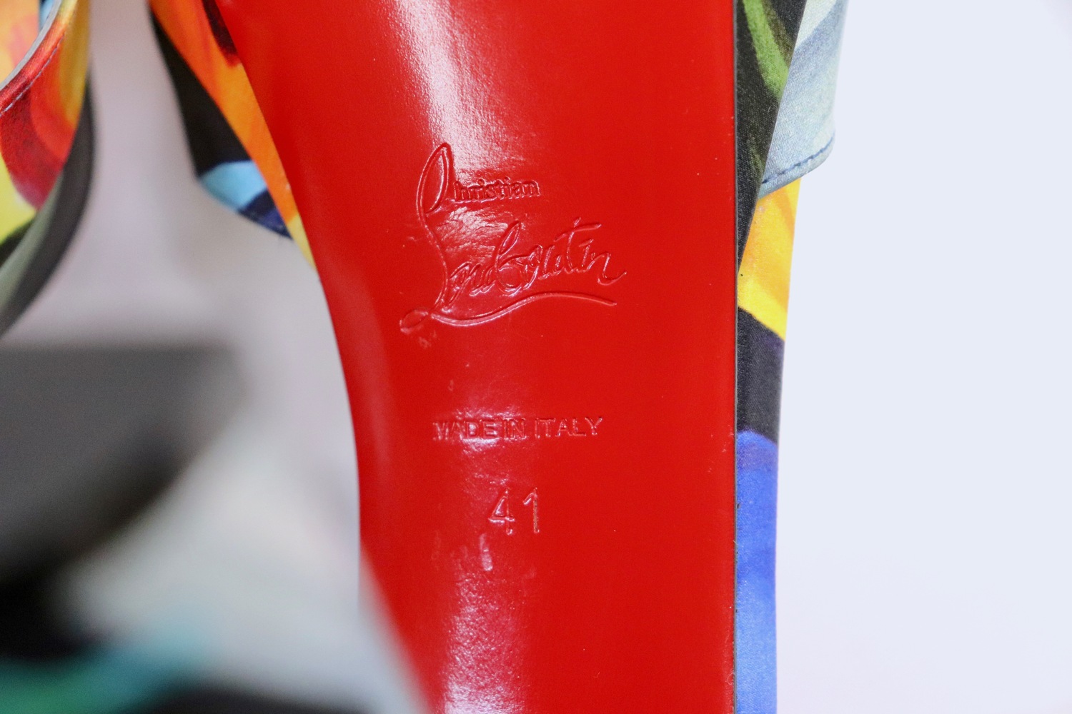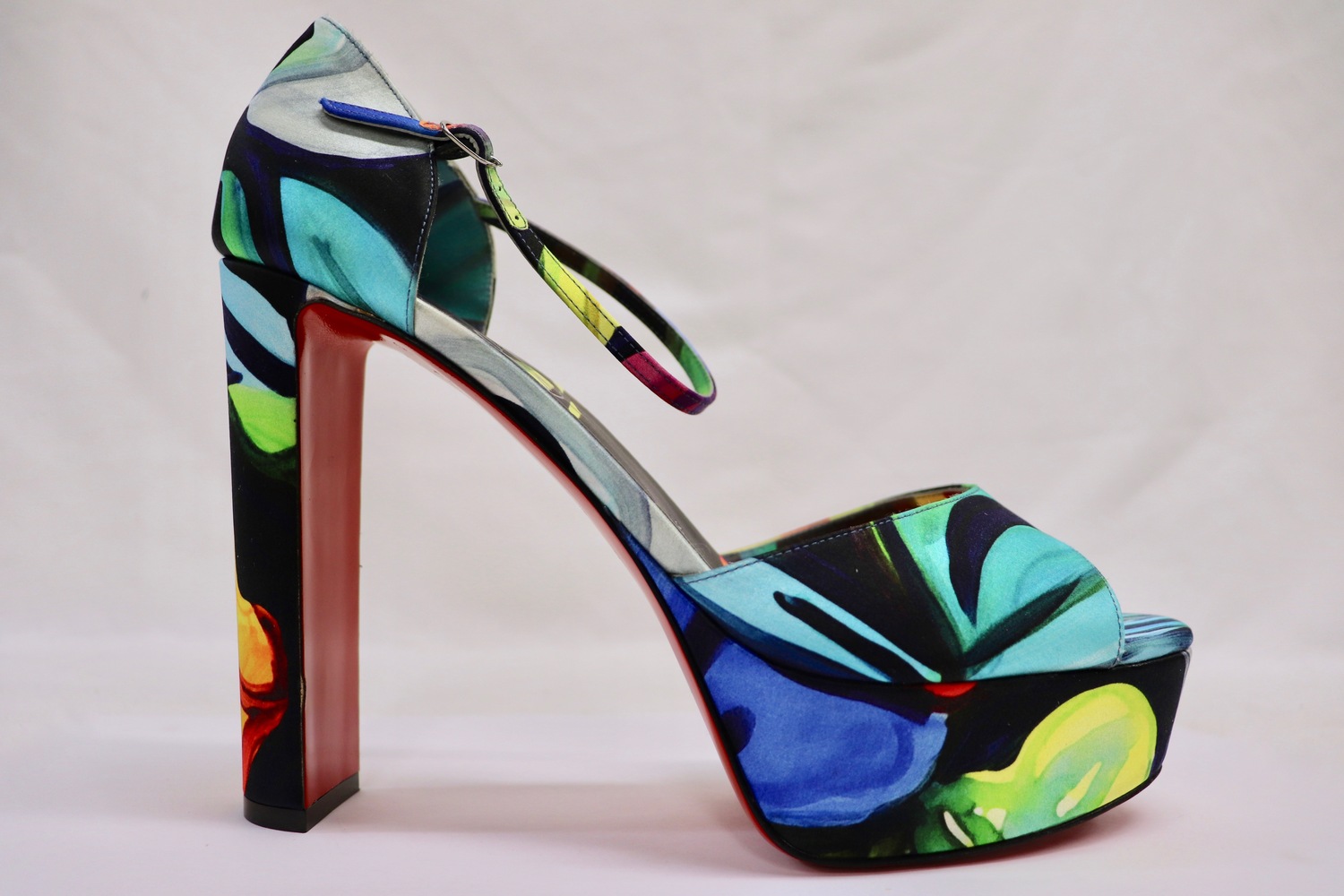 A rare, collectible Louboutin style with massive stage presence: towering heel, bold satin print, and that iconic red sole.