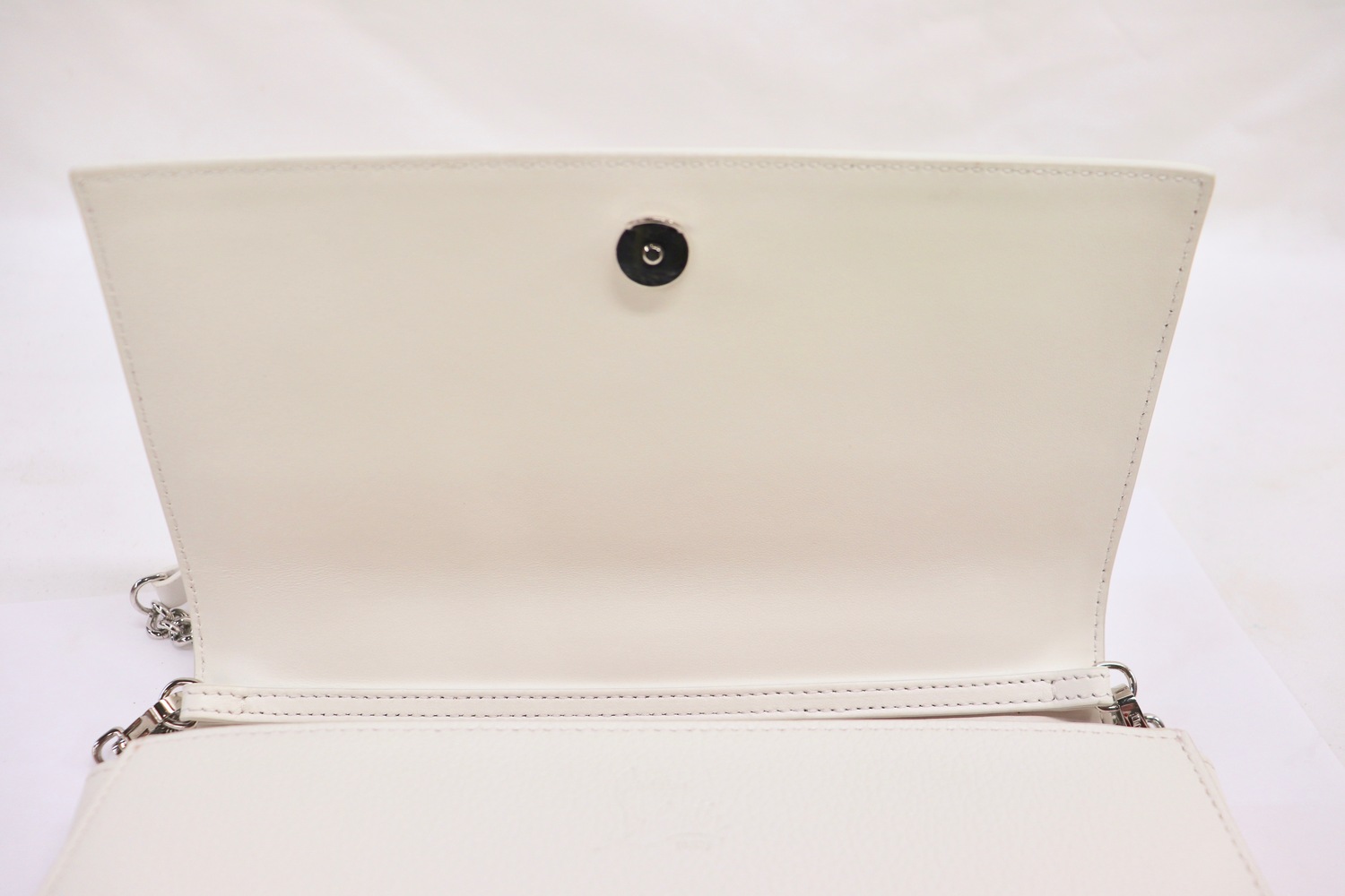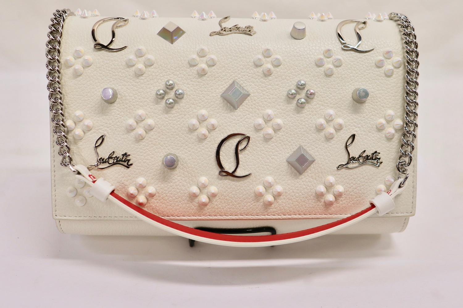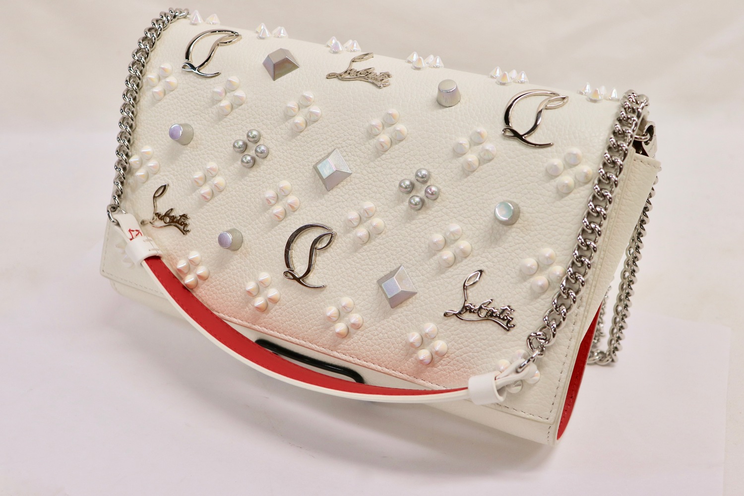 Absolutely stunning Louboutin Paloma clutch in creamy white leather, fully decked in mixed studs, pearls, spikes, and signature Louboutin “CL” logos. Chain strap, red side trim, immaculate red interior, and genuinely unused. No wear, no faults, no marks. Includes original dustbag. A collectible-level piece.
