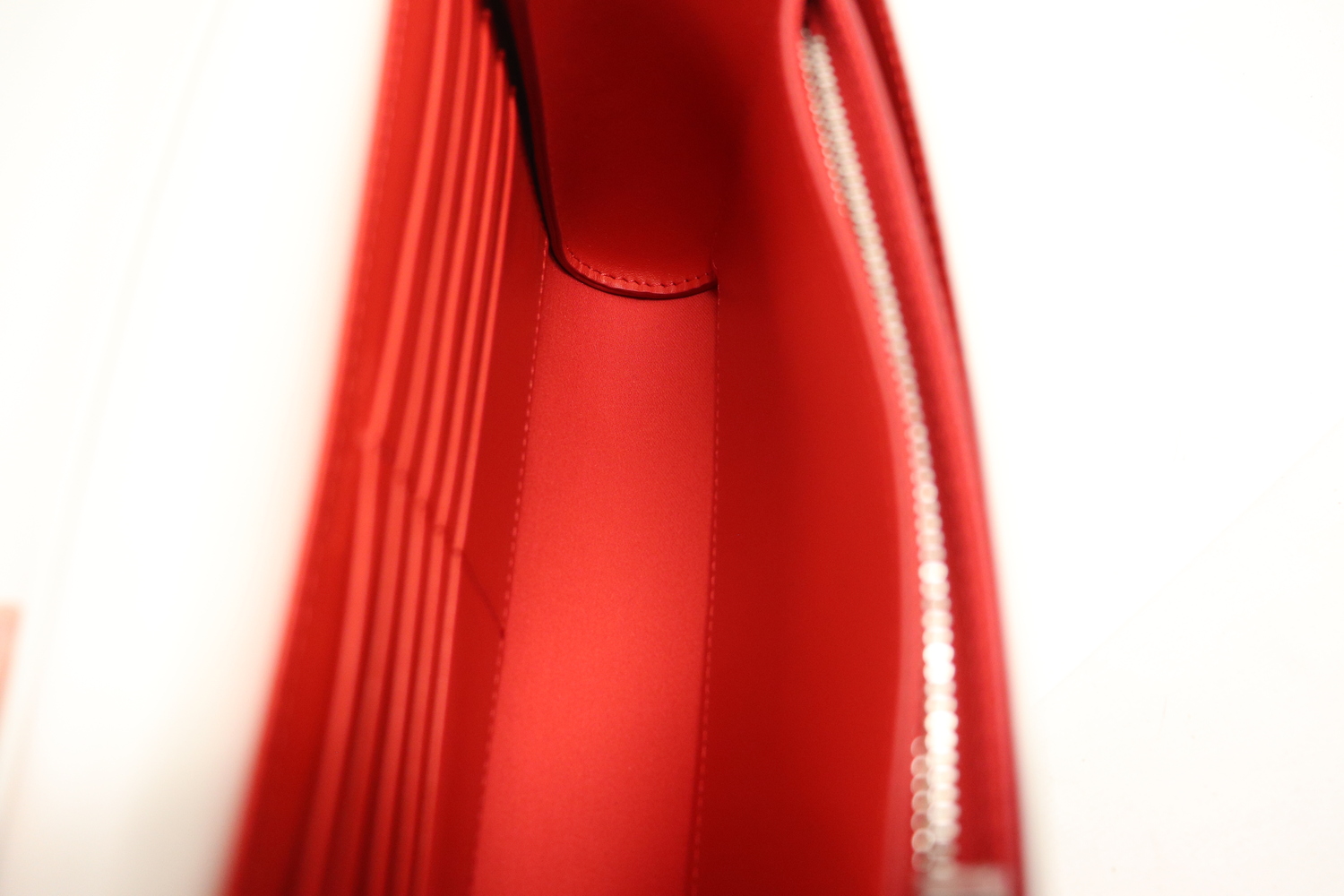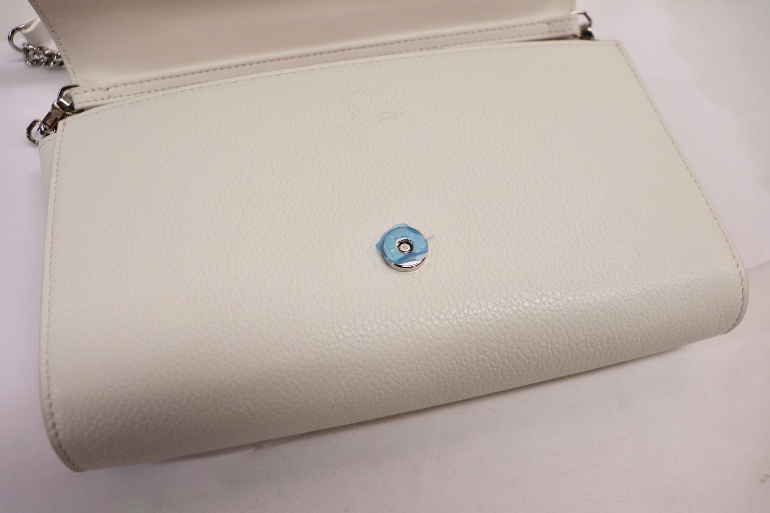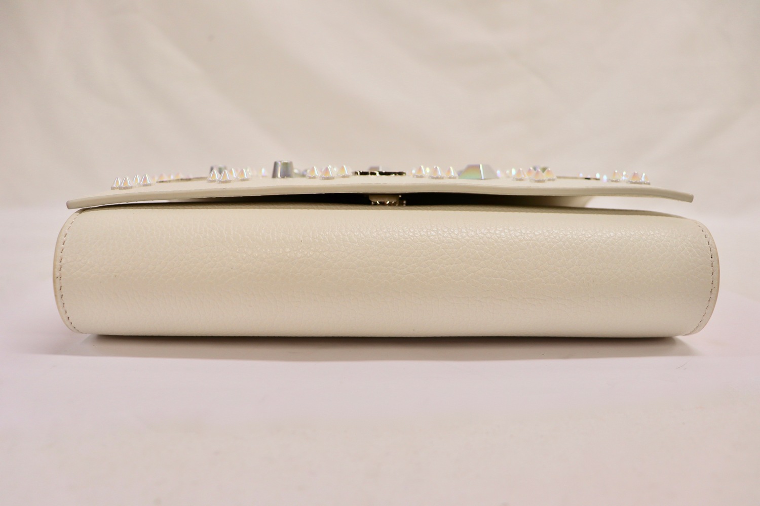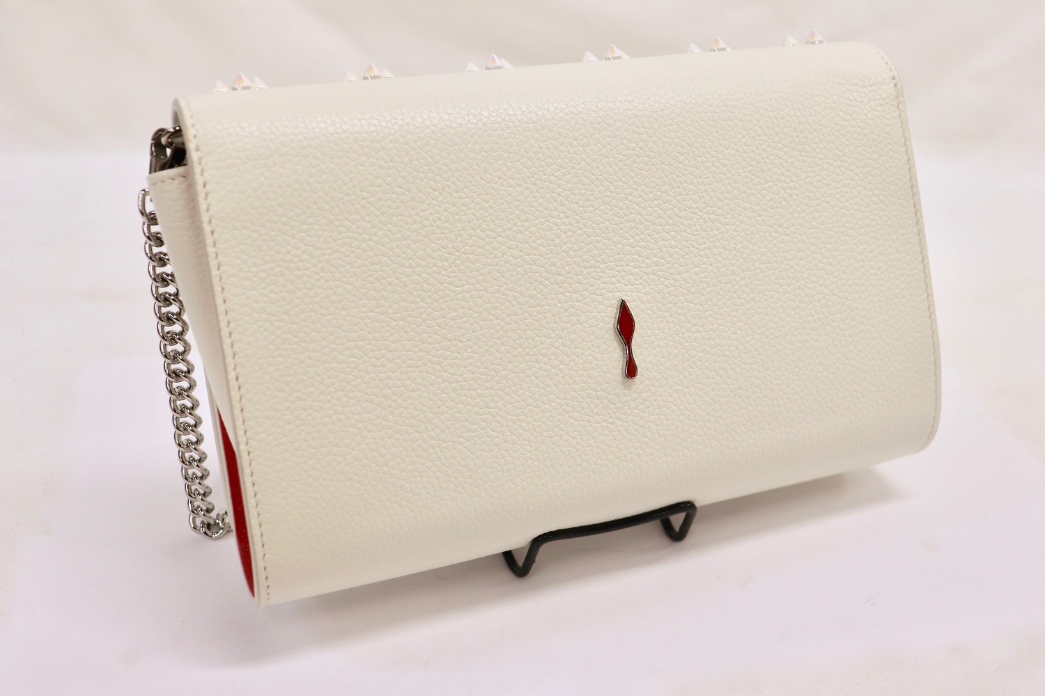 Absolutely stunning Louboutin Paloma clutch in creamy white leather, fully decked in mixed studs, pearls, spikes, and signature Louboutin “CL” logos. Chain strap, red side trim, immaculate red interior, and genuinely unused. No wear, no faults, no marks. Includes original dustbag. A collectible-level piece.