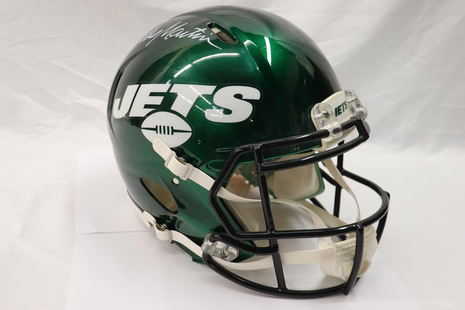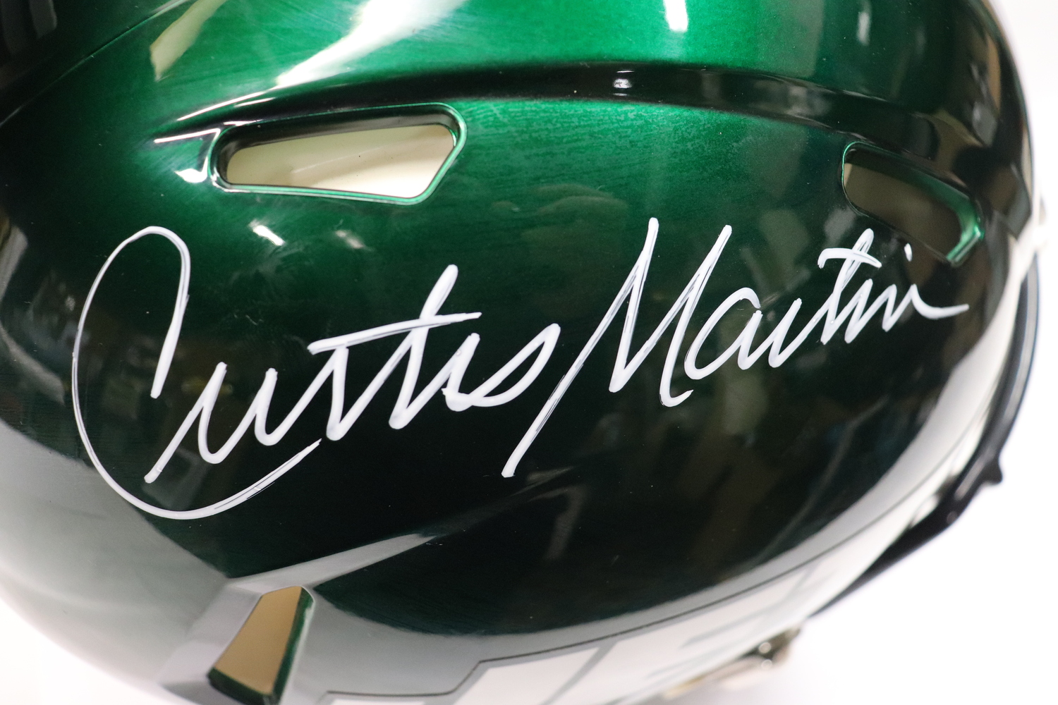 Authentic Riddell full-size NFL helmet, hand-signed by Curtis Martin of the New York Jets. A classic Jets display piece from one of the franchise’s all-time greats.