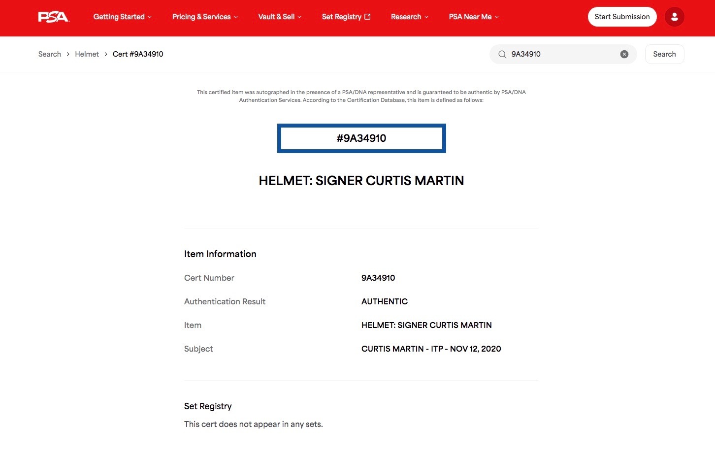 The helmet features official New York Jets graphics and a large, bold white signature, well-placed for display. Authentication is provided by PSA, with both PSA and National Football League hologram stickers affixed to the helmet, all of which verify online.