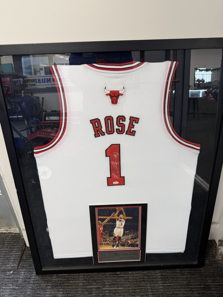 Included: Signed jersey with in game picture of Derrick Rose inside frame able to hang up.