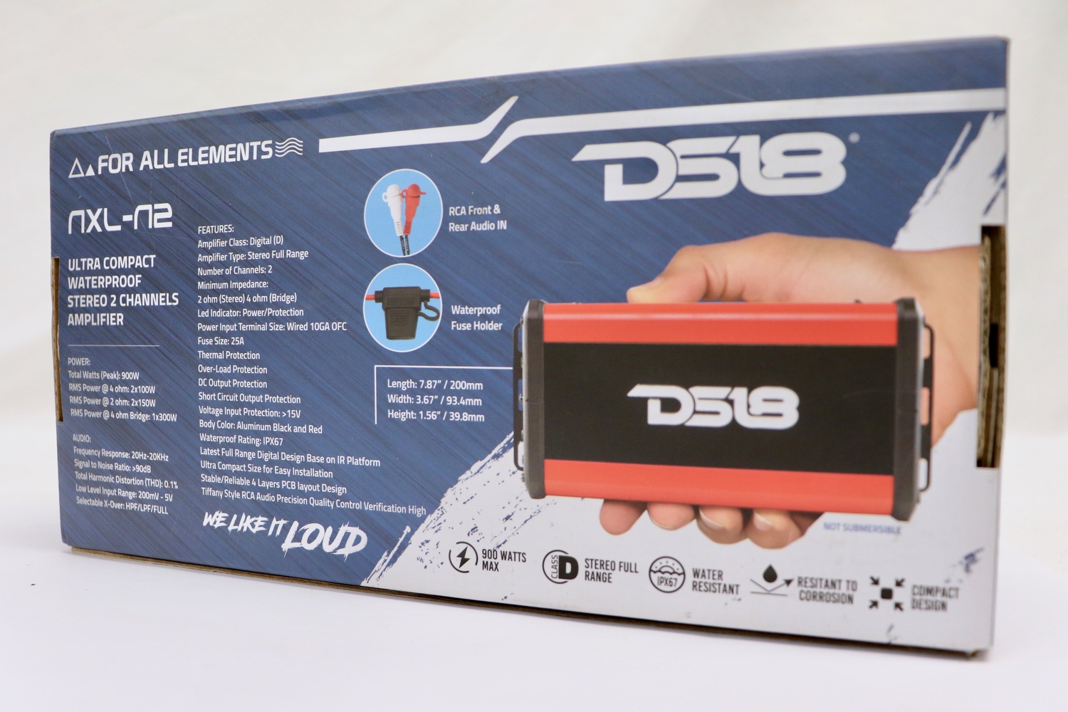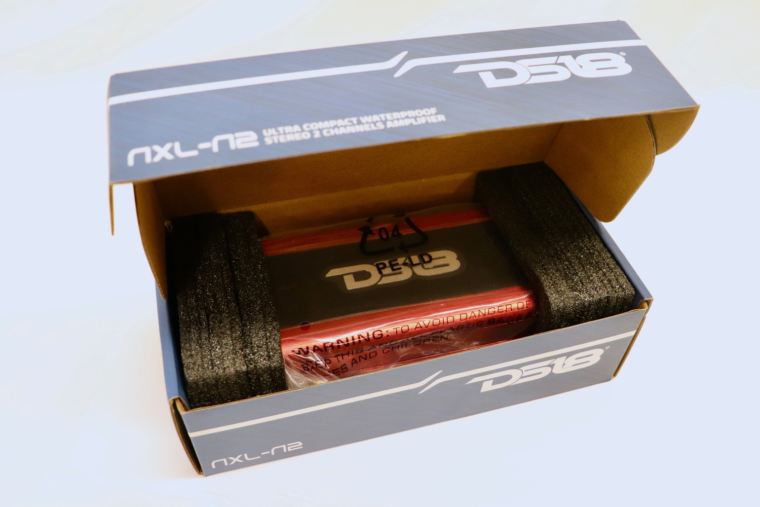 Open-box DS18 NXL-N2 Ultra Compact Waterproof Stereo Amplifier. This unit has never been installed or used and remains wrapped in original protective packaging with all included components.
