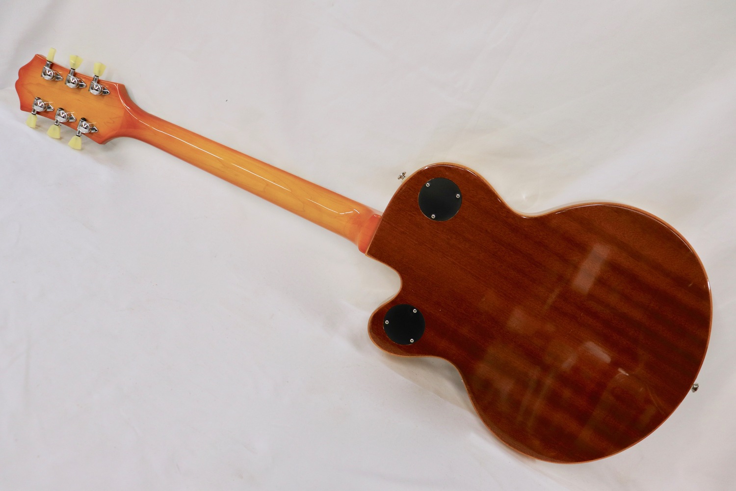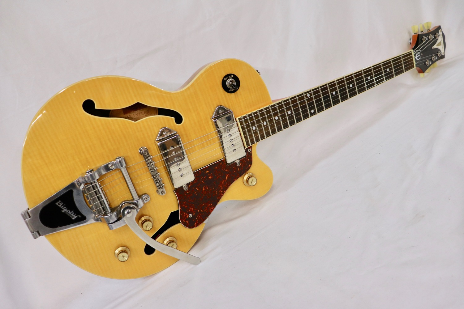 Up for grabs is an Epiphone Wildkat (Serial 311595313) in excellent, lightly played condition. This one is a stunner- natural flame-maple top, classic tort guard, chrome hardware, and that unmistakable licensed Bigsby vibrato. It’s clean, shiny, and ready to hit the stage, studio, or your living room couch blues session.