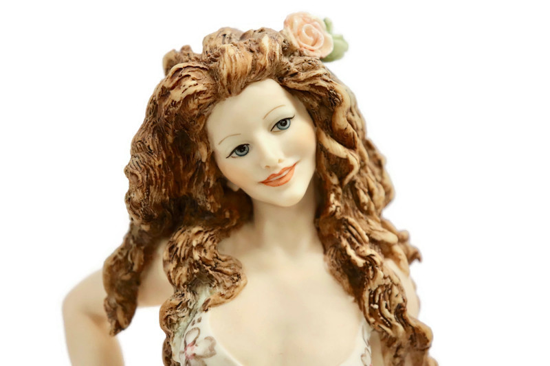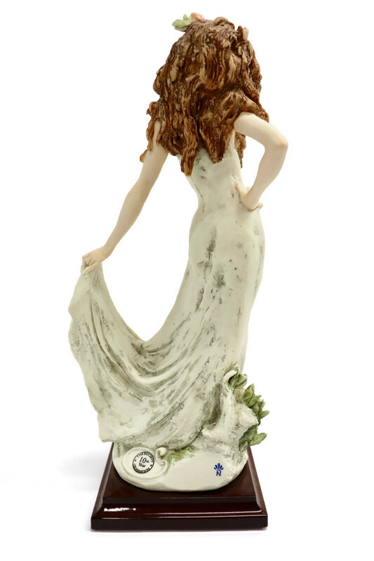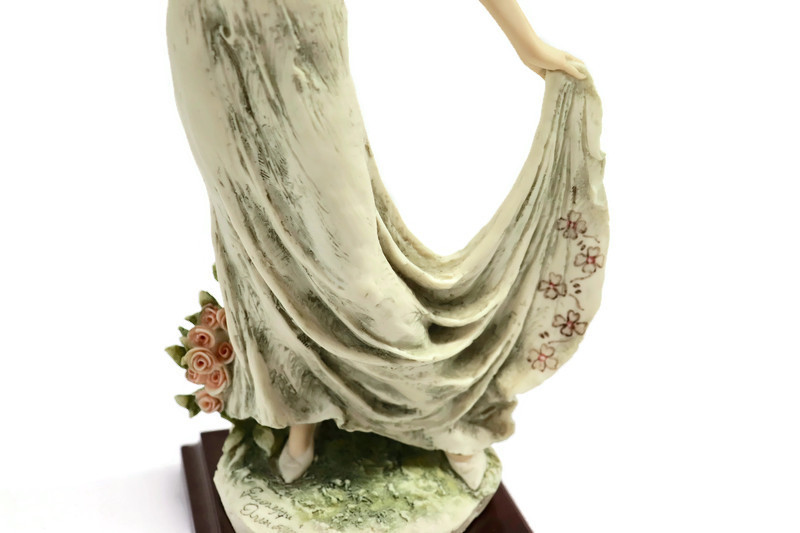 Graceful Giuseppe Armani Celebration (#1260C) from the Florence Collection / The Society, Made in Italy. Features a young woman lifting her gown, finely modeled hair, soft facial painting, roses at the base, and the original wood stand with brass Florence Giuseppe Armani badge. Molded Armani signature on the base; underside carries the 1260C label. Comes with the pictured Florence Society booklet, tag, and cards.