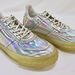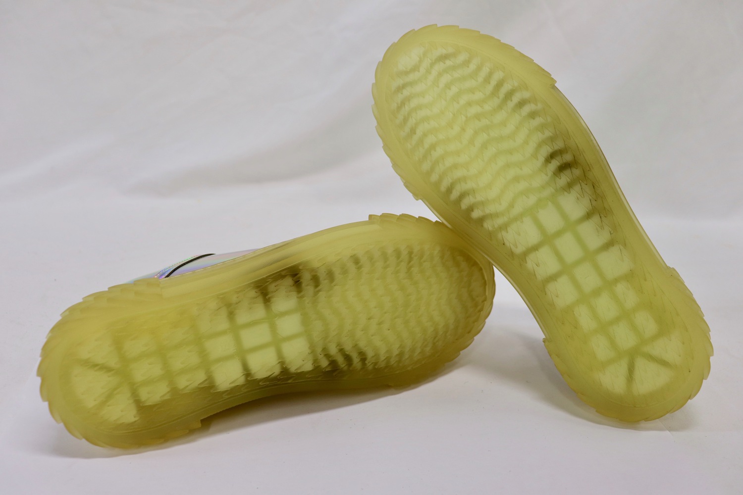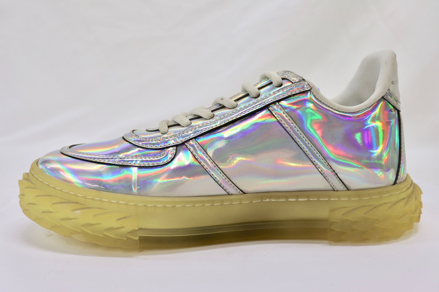 Authentic Giuseppe Zanotti women’s sneakers crafted in a striking iridescent silver leather with a translucent rubber sole. These feature a sleek low-top silhouette with high-fashion materials and Zanotti’s signature bold aesthetic. A standout designer sneaker that catches the light from every angle.