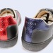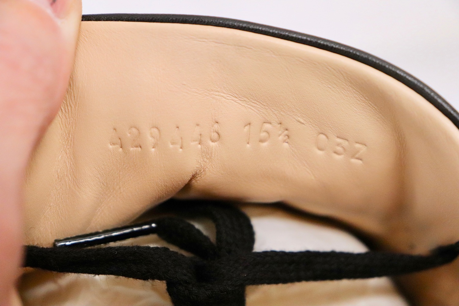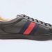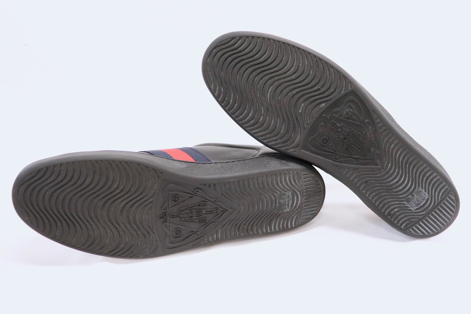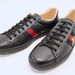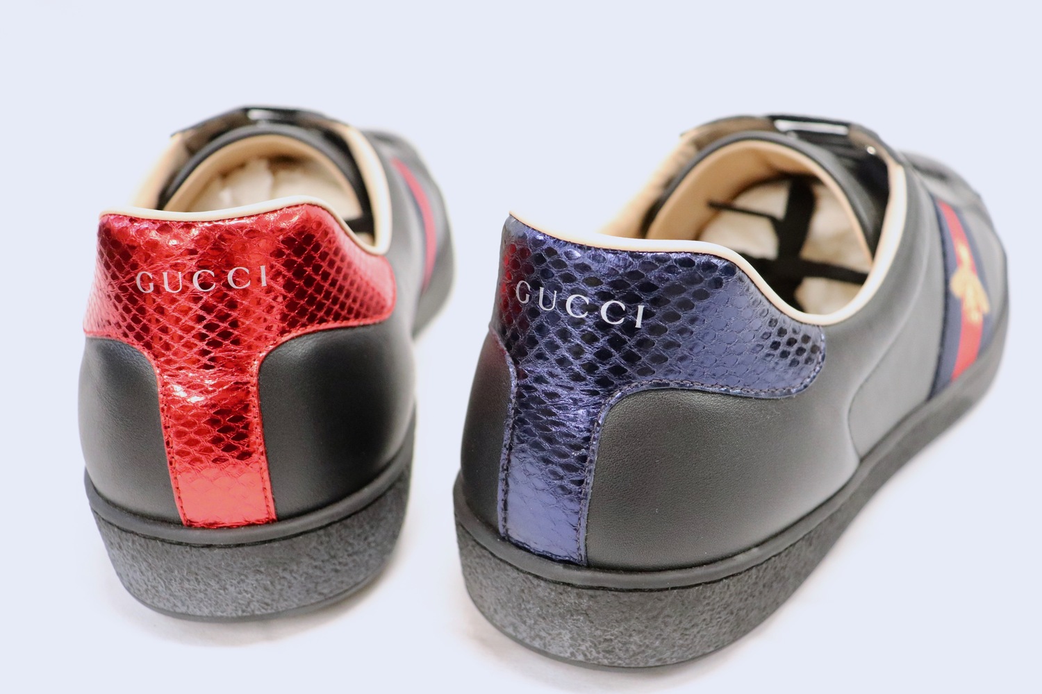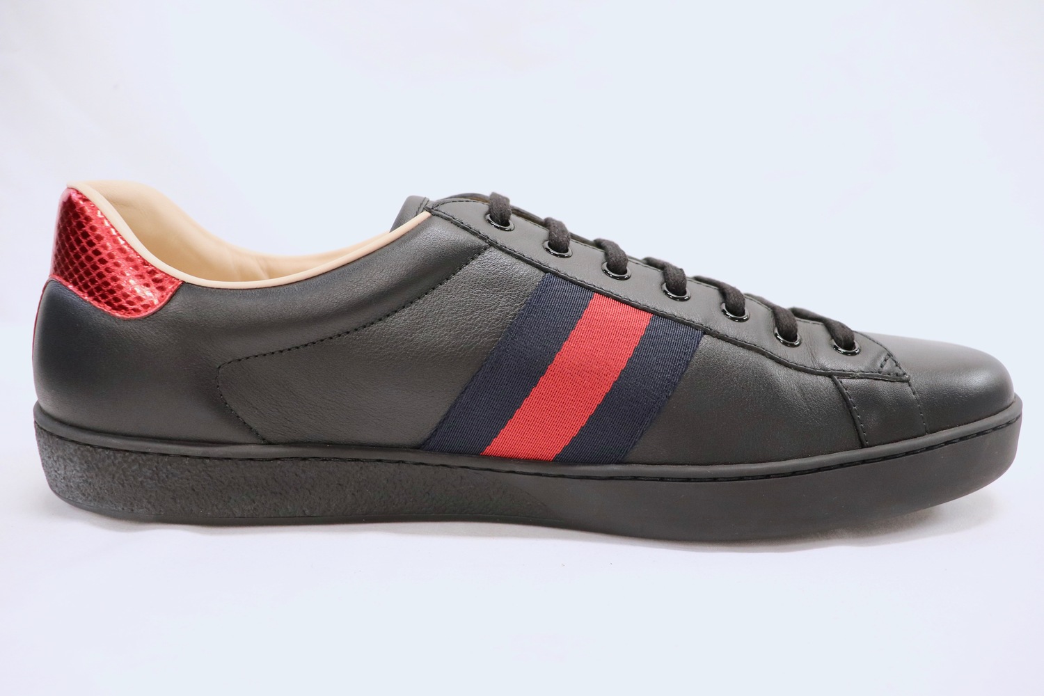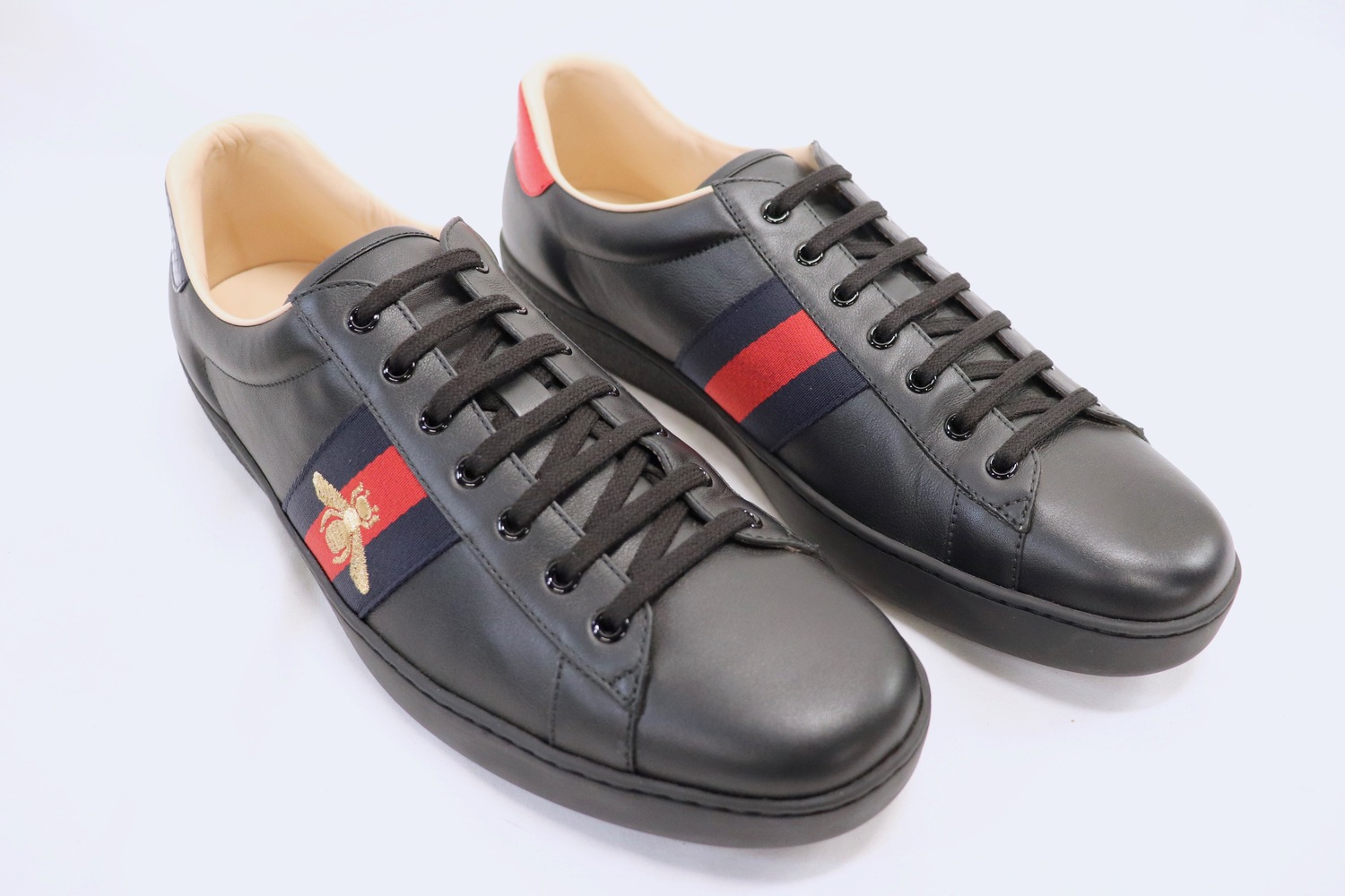 Authentic GUCCI Ace “Black Bee” low-top sneakers in black leather with GUCCI web stripe and embroidered bee detail. Iconic Ace silhouette with standout mismatched heel tabs. Perfect statement pair in a hard-to-find size.