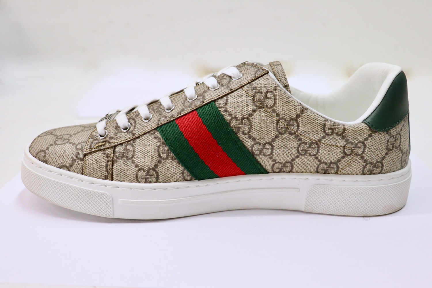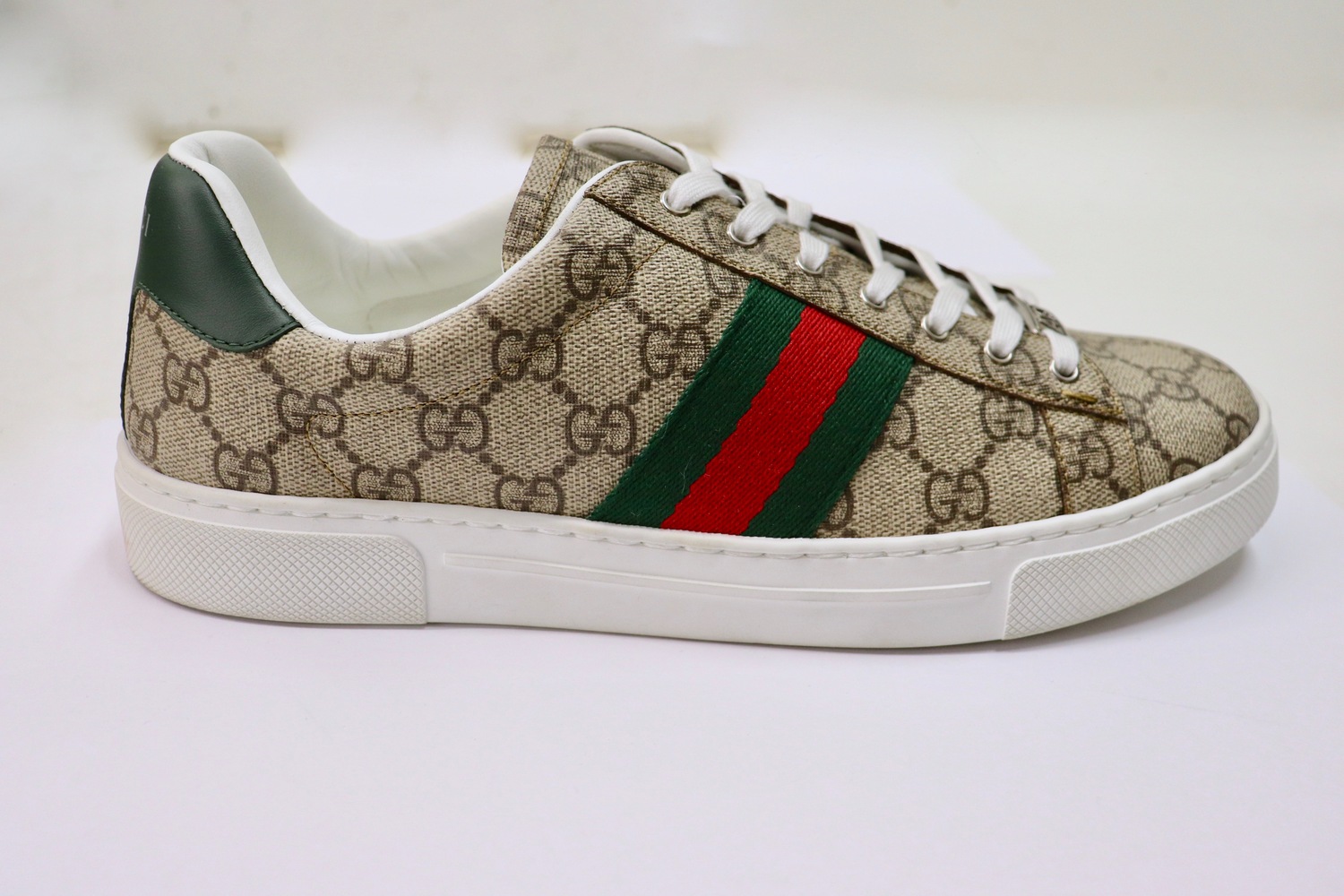 Authentic GUCCI Ace GG Supreme sneakers featuring the iconic GUCCI monogram canvas with signature green/red web stripe. Classic low-top Ace silhouette in an unworn, near-new condition with full original accessories.