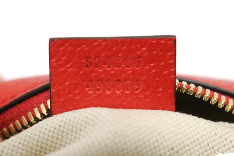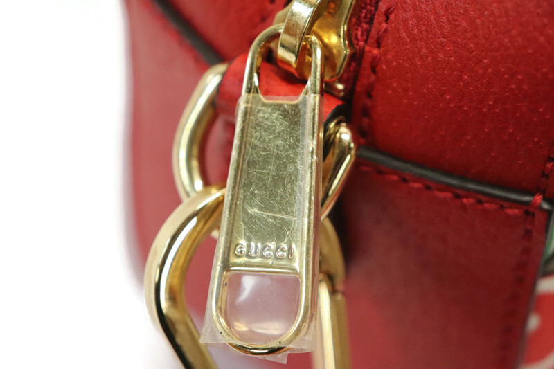 •  Trim/Details: Bright red cotton web strap (detachable), gold hardware