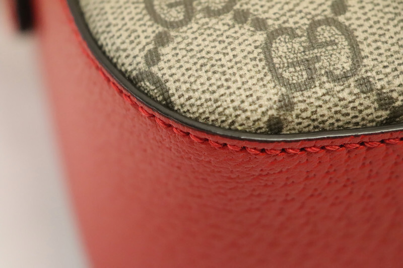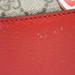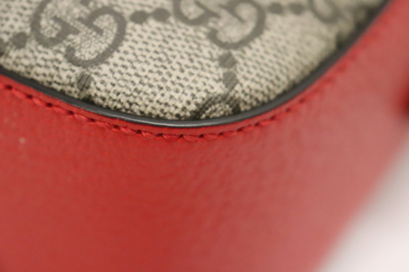 Here’s an authentic GUCCI Apple Monogram Camera Crossbody in excellent pre-owned condition. Features the GG Supreme print with repeating “apple” motif, gold-tone hardware (zipper pull still has protective film), a bright red detachable wide cotton web strap for shoulder or crossbody wear, and a clean natural linen interior (no odors, spot-free). Shows one minor scuff at bottom edge (see close-up photo) but otherwise outstanding. Includes Entrupy Certificate of Authenticity.