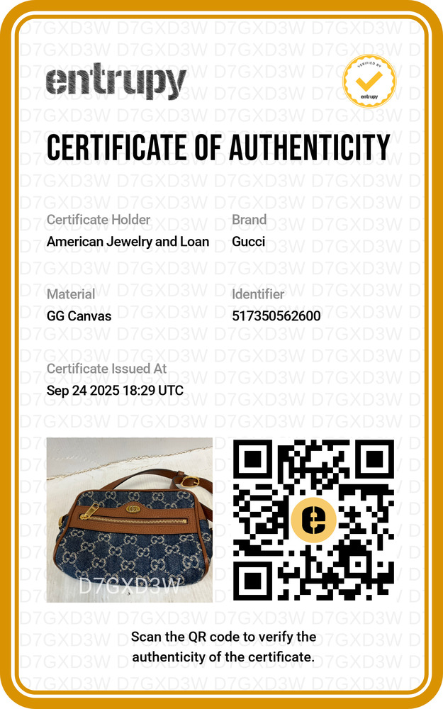 Authentic Gucci GG Denim Canvas Crossbody Bag featuring classic blue GG monogram denim with brown leather trim and gold-tone hardware. This versatile bag includes an adjustable shoulder strap, Gucci dust bag, and a Certificate of Authenticity (Entrupy – QR code included in photos).