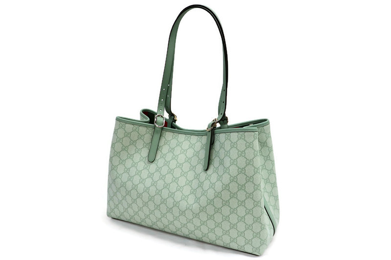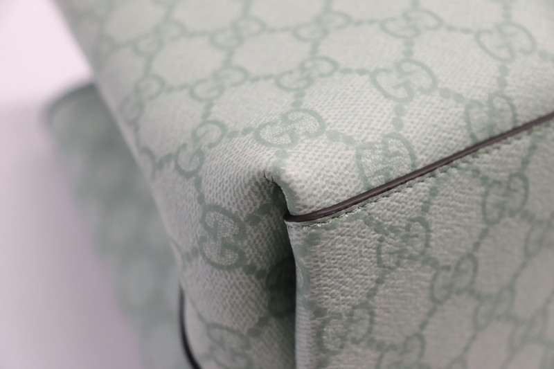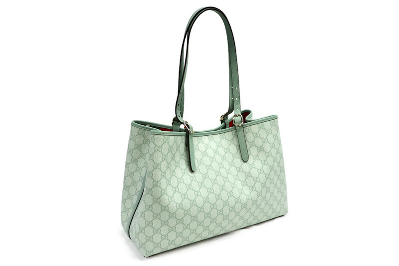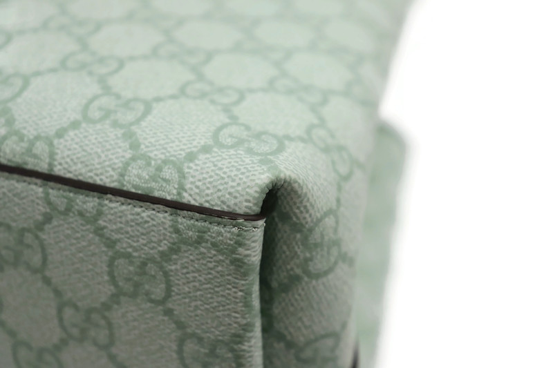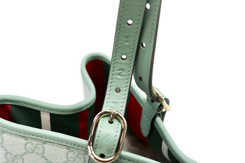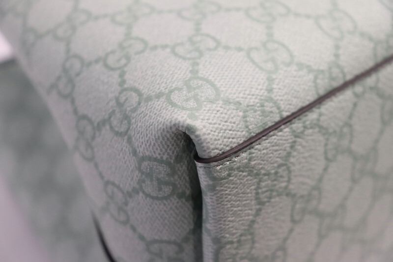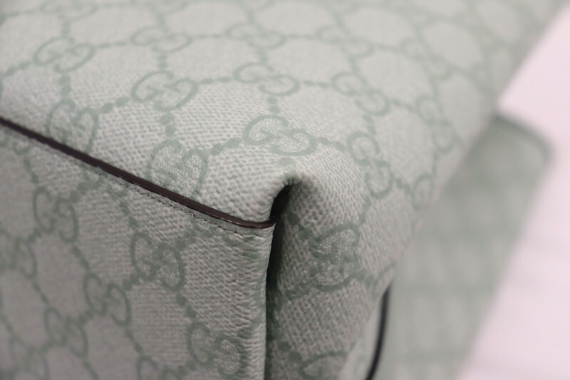 This piece is crafted in coated GG monogram canvas with sage green leather trim and GUCCIs green-and-red Web lining. Inside, its practical and organized, with two open compartments and a central zip compartment that easily fits your daily essentials.