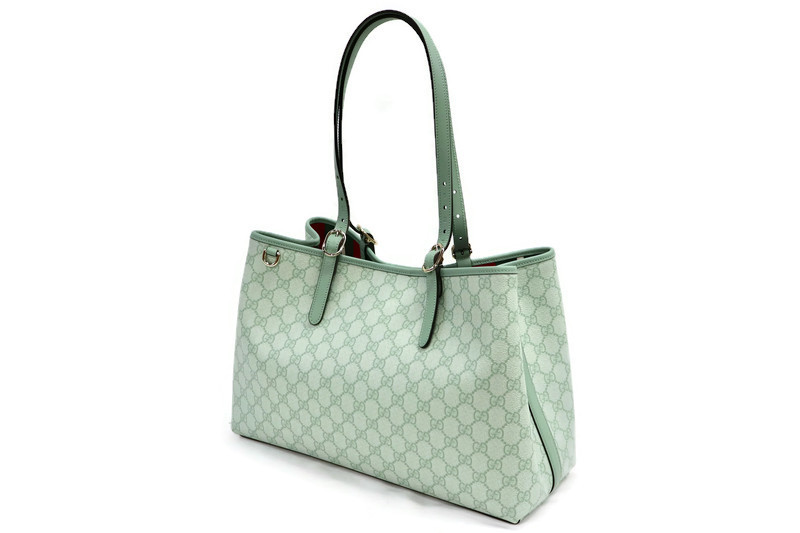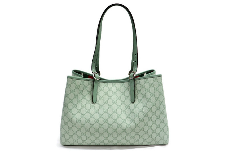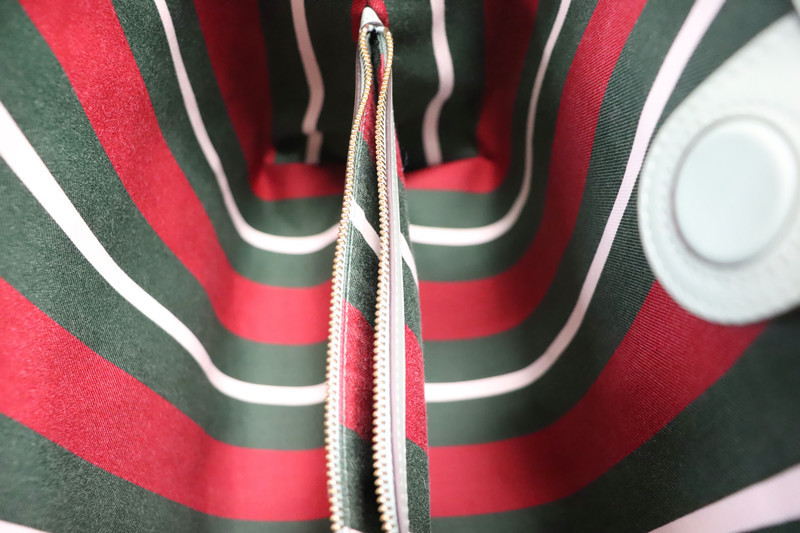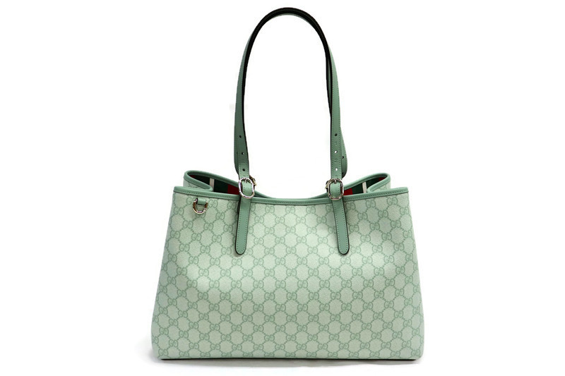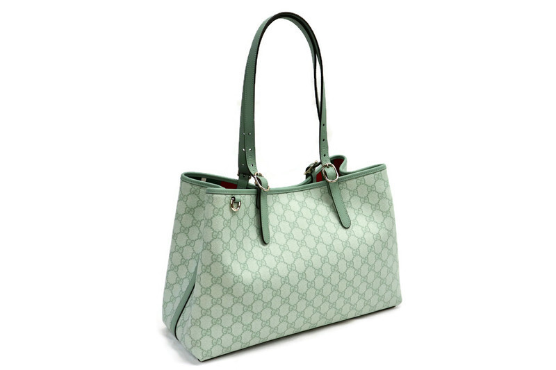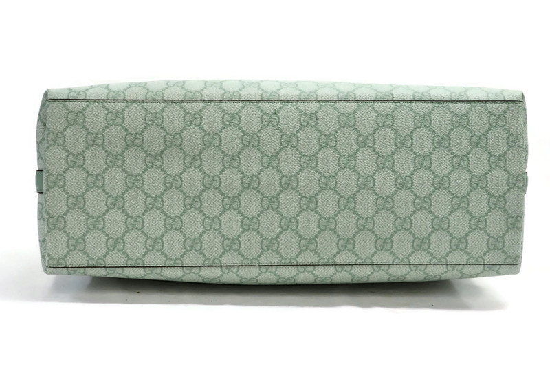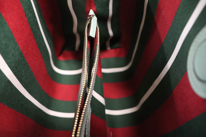 This piece is crafted in coated GG monogram canvas with sage green leather trim and GUCCIs green-and-red Web lining. Inside, its practical and organized, with two open compartments and a central zip compartment that easily fits your daily essentials.