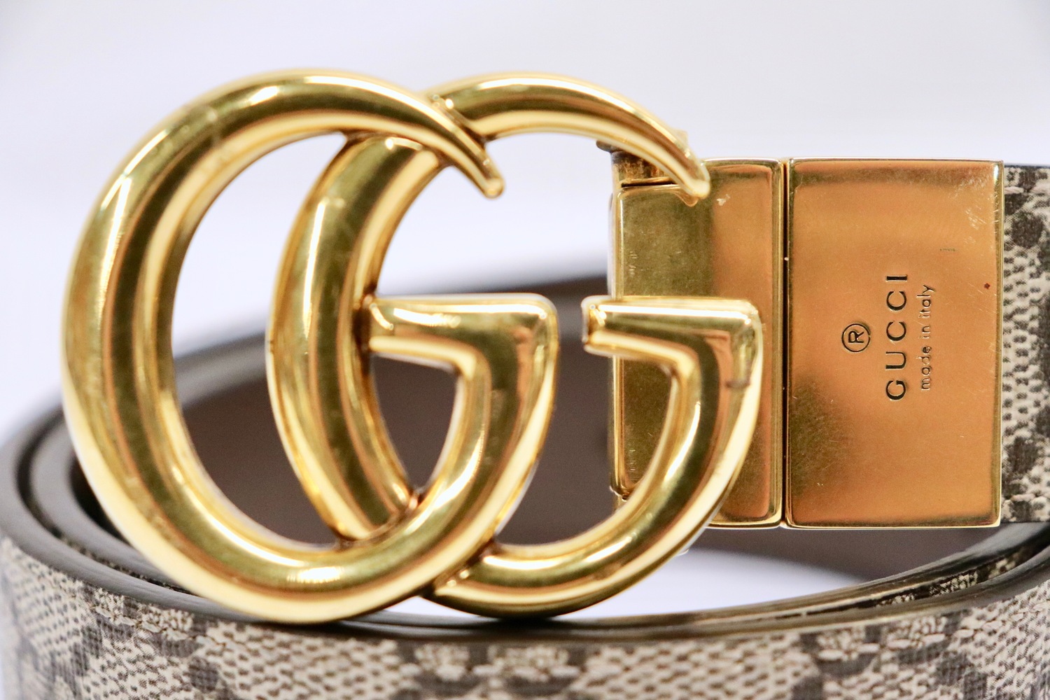 •  Gold-tone GG hardware is bright and clean