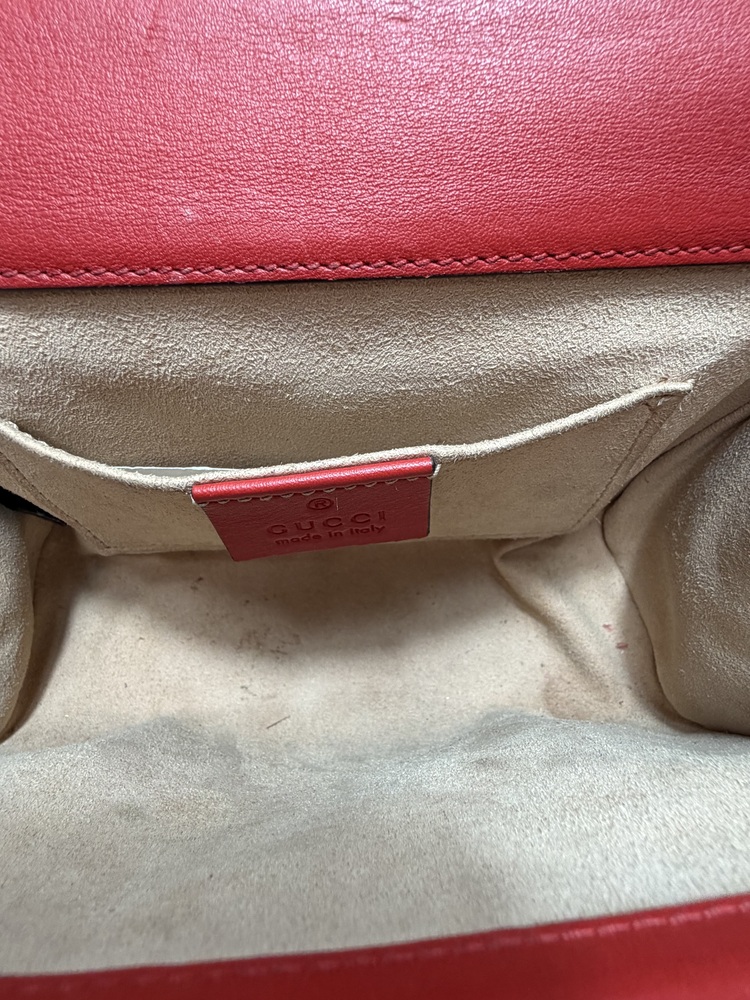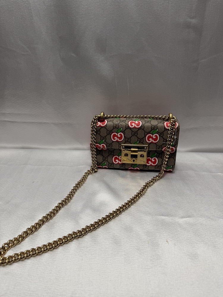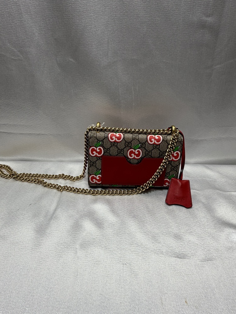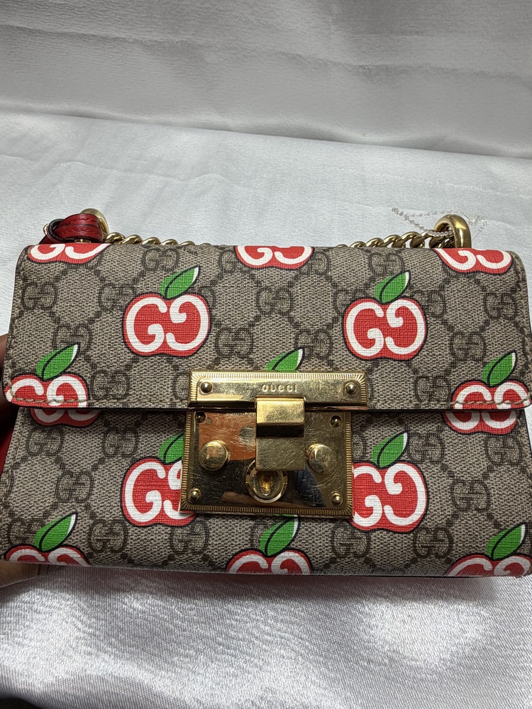 This Gucci Padlock bag is a collectible and stylish piece that combines classic Gucci design with a unique apple motif, making it a standout addition to any luxury handbag collection.