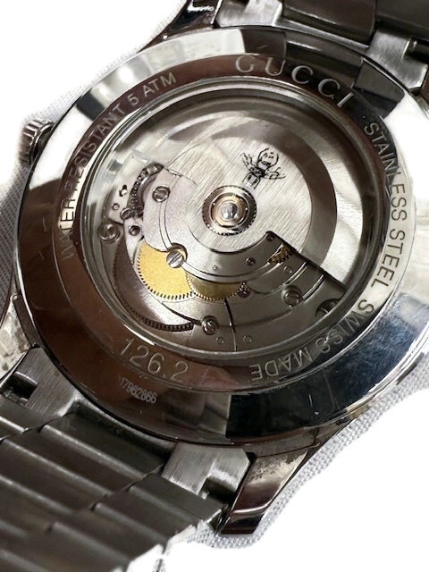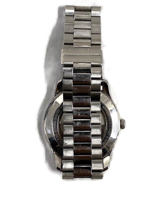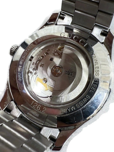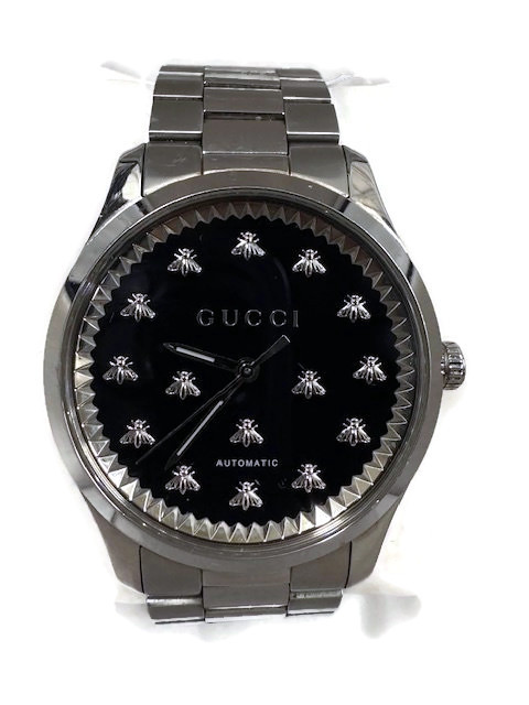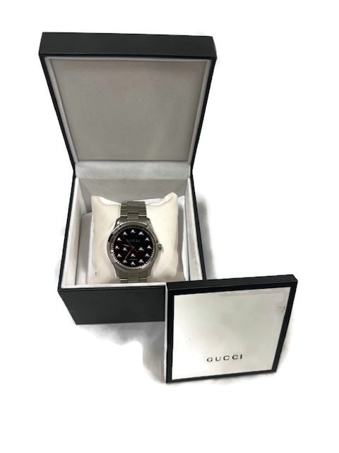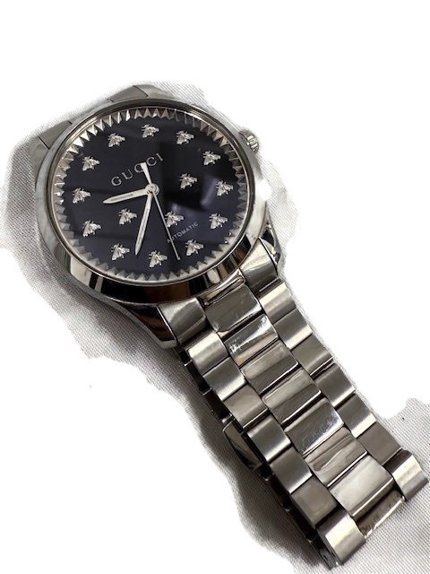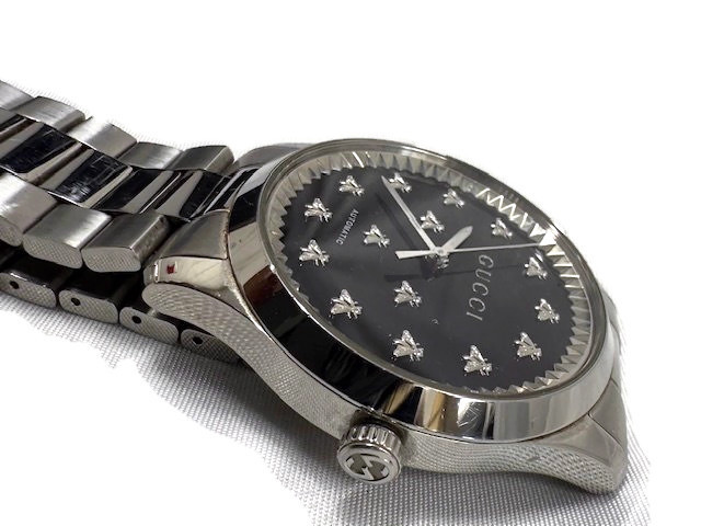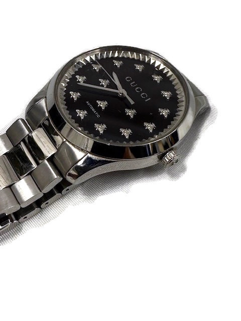 Premium pre-owned Gucci G-Timeless Men's Watch , equipped with Swiss automatic movement, presents excellent functionality despite visible scratches on the stainless steel band. Features a Swiss automatic movement, striking black dial and robust stainless steel body. A sublime blend of elegance and performance.