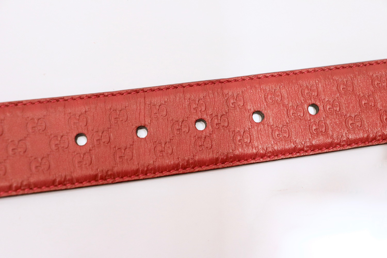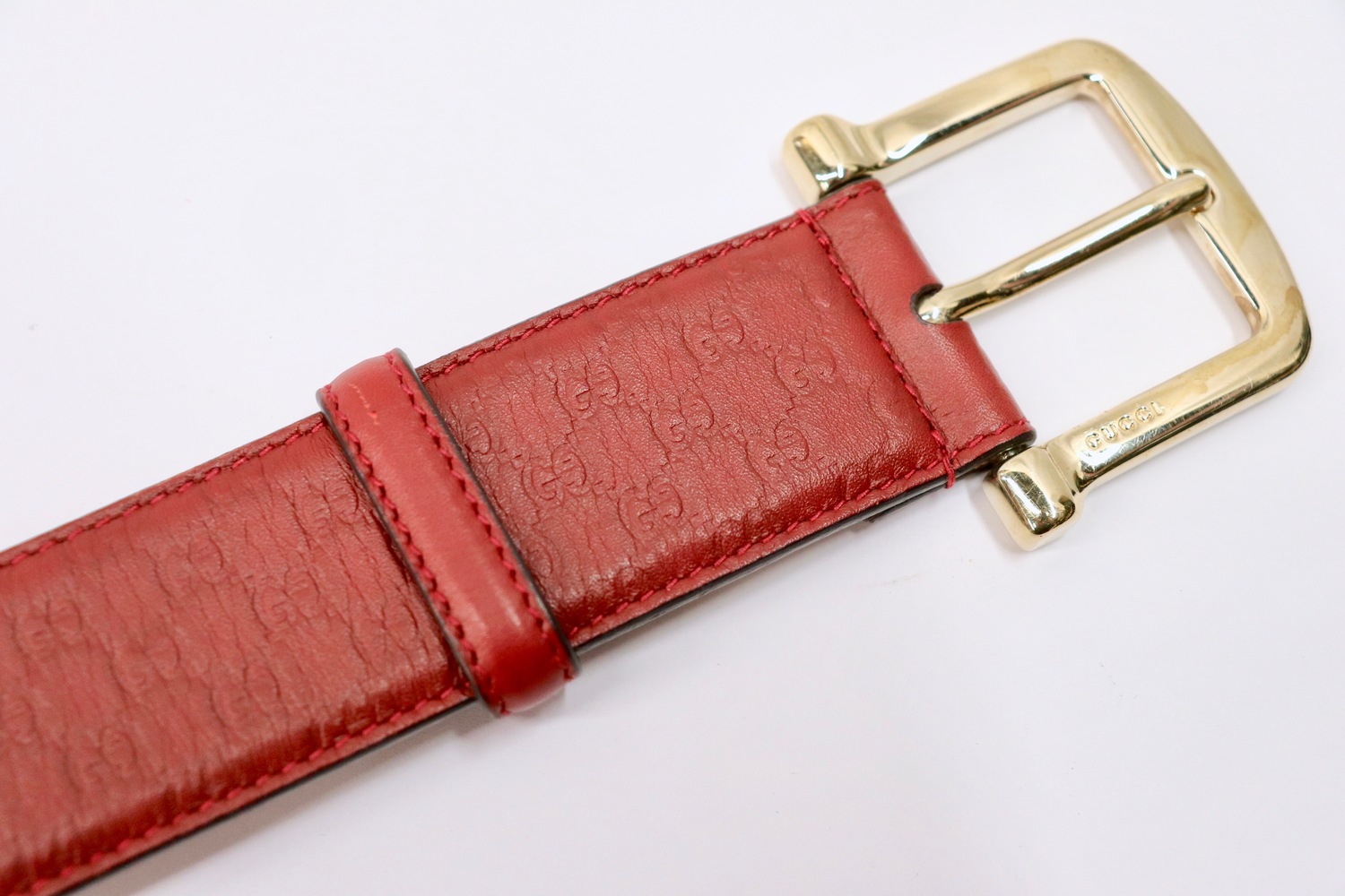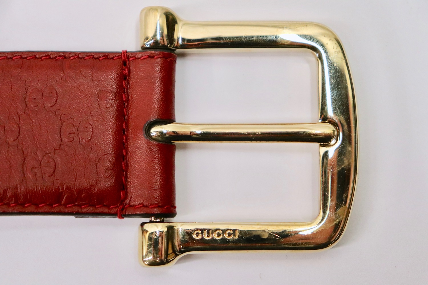 GUCCI red leather Guccissima belt, model 284548 / 525040, featuring embossed GG pattern and gold-tone buckle. A classic statement belt with bold color and timeless GUCCI styling.