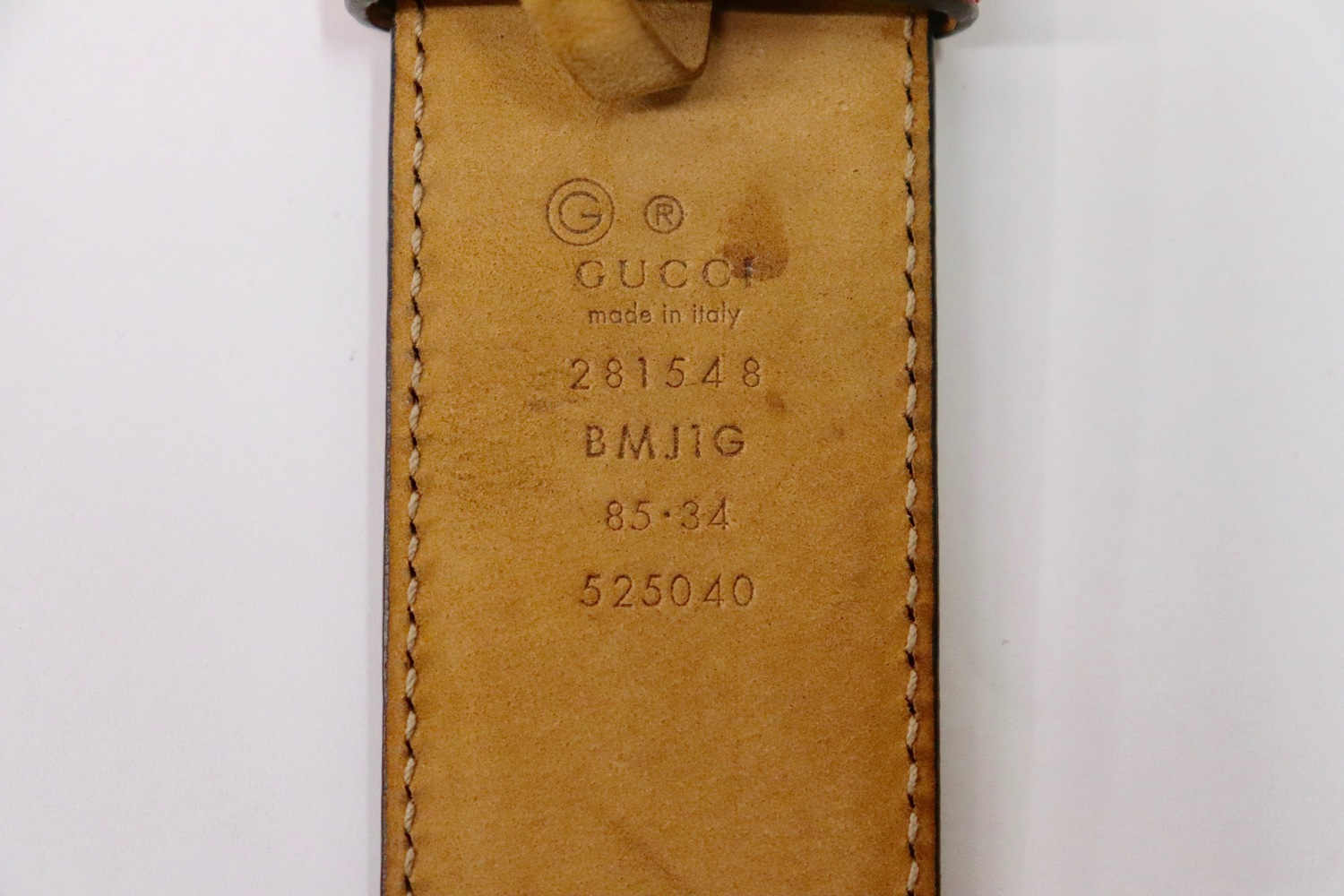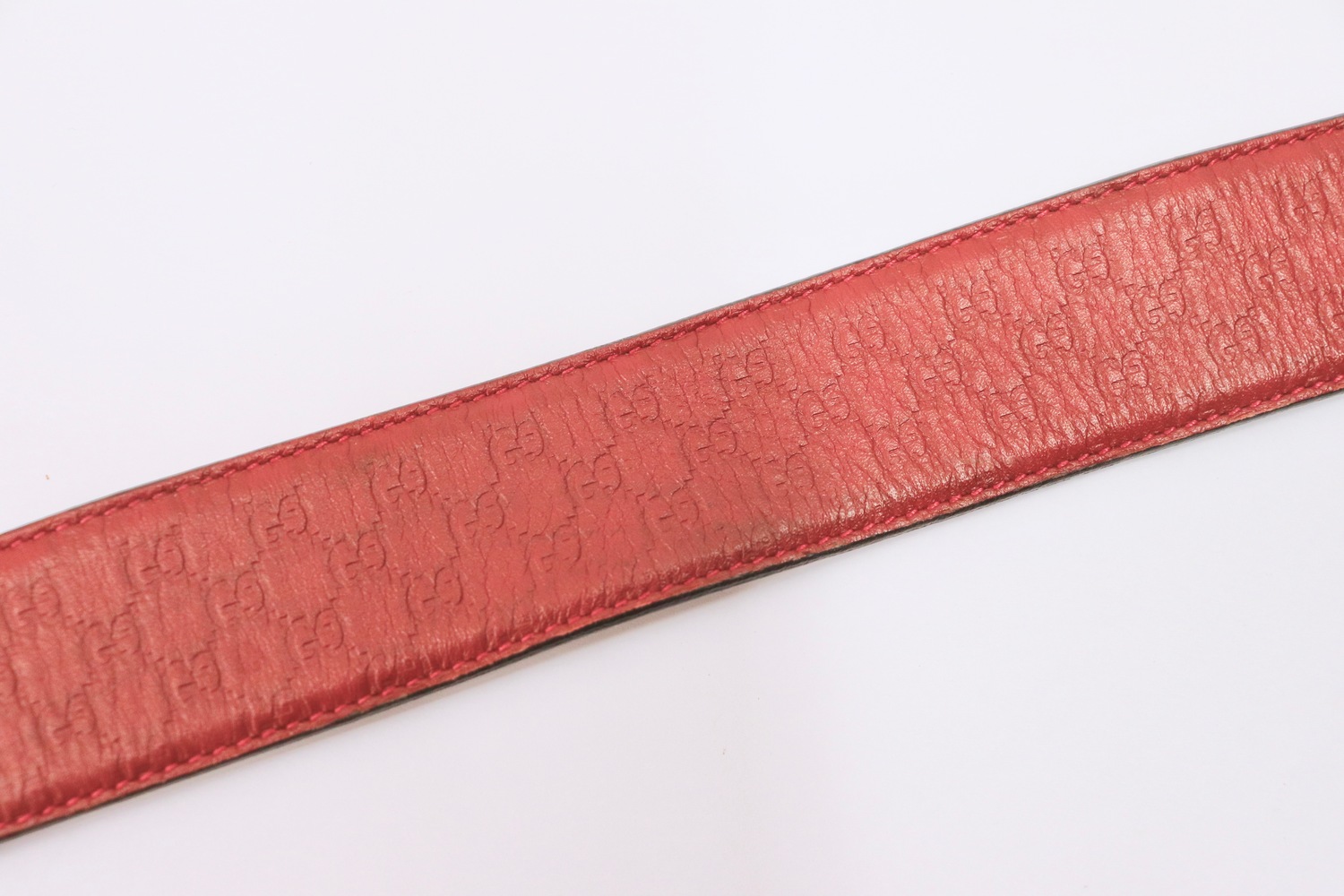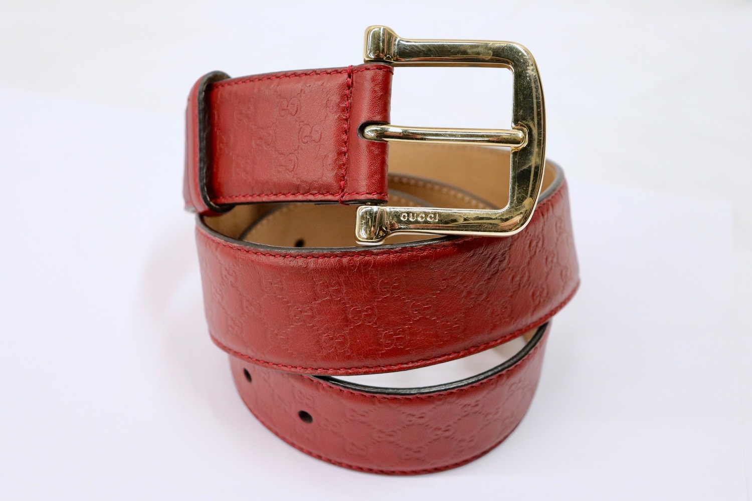 GUCCI red leather Guccissima belt, model 284548 / 525040, featuring embossed GG pattern and gold-tone buckle. A classic statement belt with bold color and timeless GUCCI styling.