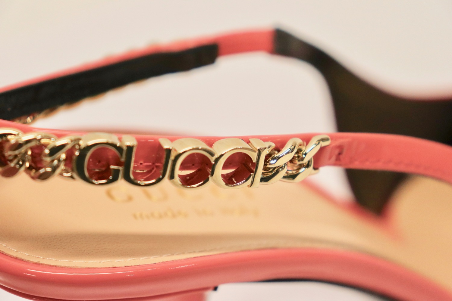 Bold, glossy, and unapologetically GUCCI. These Charlotte Slingback Pumps in “Bubble Gum” pink patent leather combine playful color with sharp sophistication. Crafted in Italy from Vernice Crystal/Nappa leather, they feature a pointed toe, slim stiletto heel, and silver-tone chain strap detail for a hint of rock-chic edge.